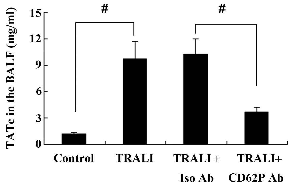 TRALI is the result of endothelial activation, and the endothelium initiates and regulates coagulation (30). It was reported that coagulopathy has important roles in TRALI (31). In the present study, infusion with MHC-1 antibody resulted in increased pulmonary and systemic coagulation, with increased thrombin generation as reflected by the TATc levels. Anti-CD62P antibody treatment attenuated the increase of pulmonary and systemic coagulation in TRALI, as evidenced by decreased TATc levels in the TRALI + anti-CD62P antibody group compared with those in the TRALI group. These results indicated that CD62P was involved in pulmonary and systemic coagulation in TRALI.