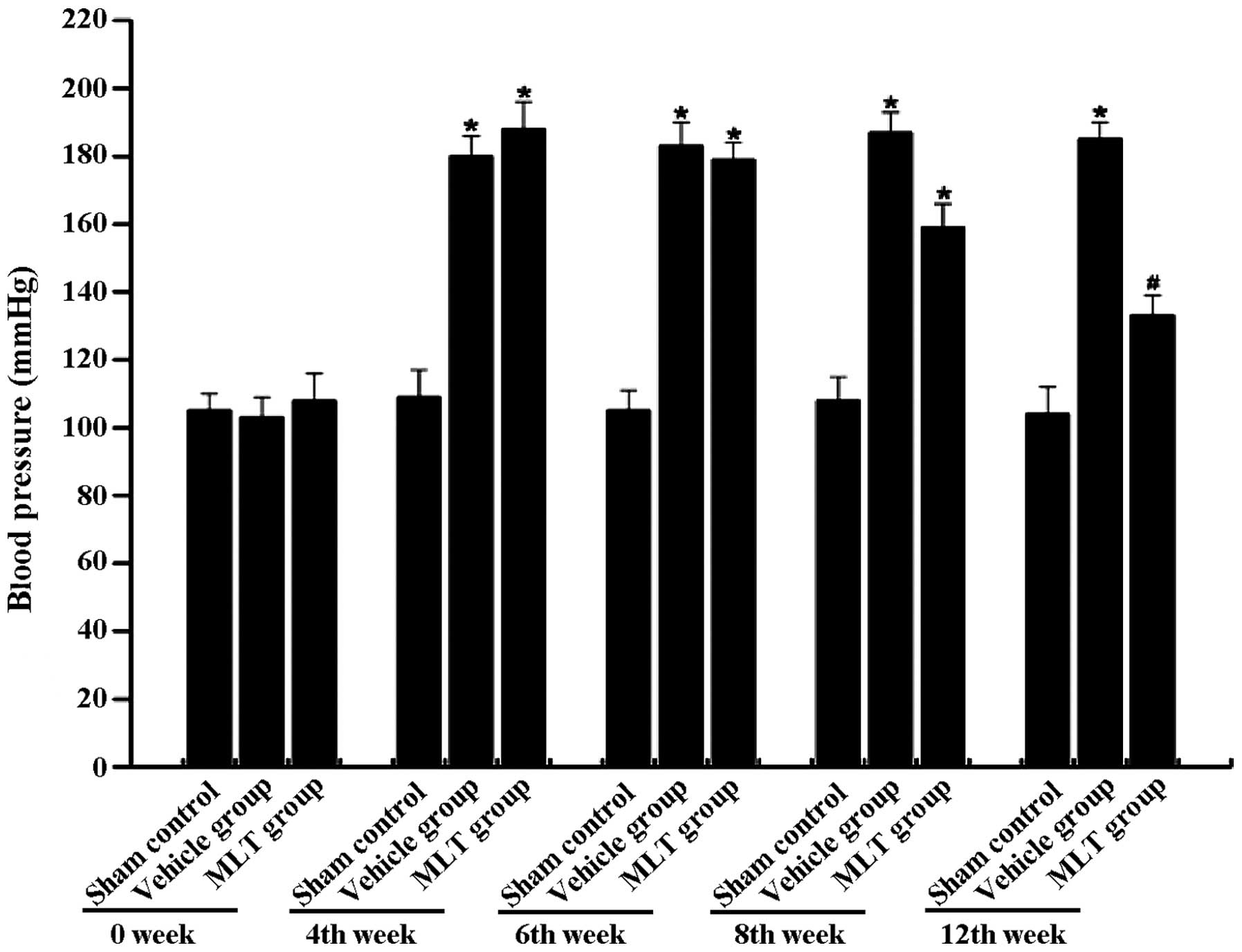 The blood pressure in each group was monitored at weeks 0, 4, 6, 8 and 12 of MLT treatment. Compared with the sham control group, a significant increase in blood pressure was observed in the vehicle group at weeks 4, 6, 8 and 12 (P<0.01) (Fig. 1). In the MLT group, a significant increase in blood pressure was observed at weeks 4, 6 and 8 (P<0.05). However, MLT treatment significant attenuated the hypertension-induced increase in blood pressure at week 12 compared with that in the vehicle group (P<0.01).