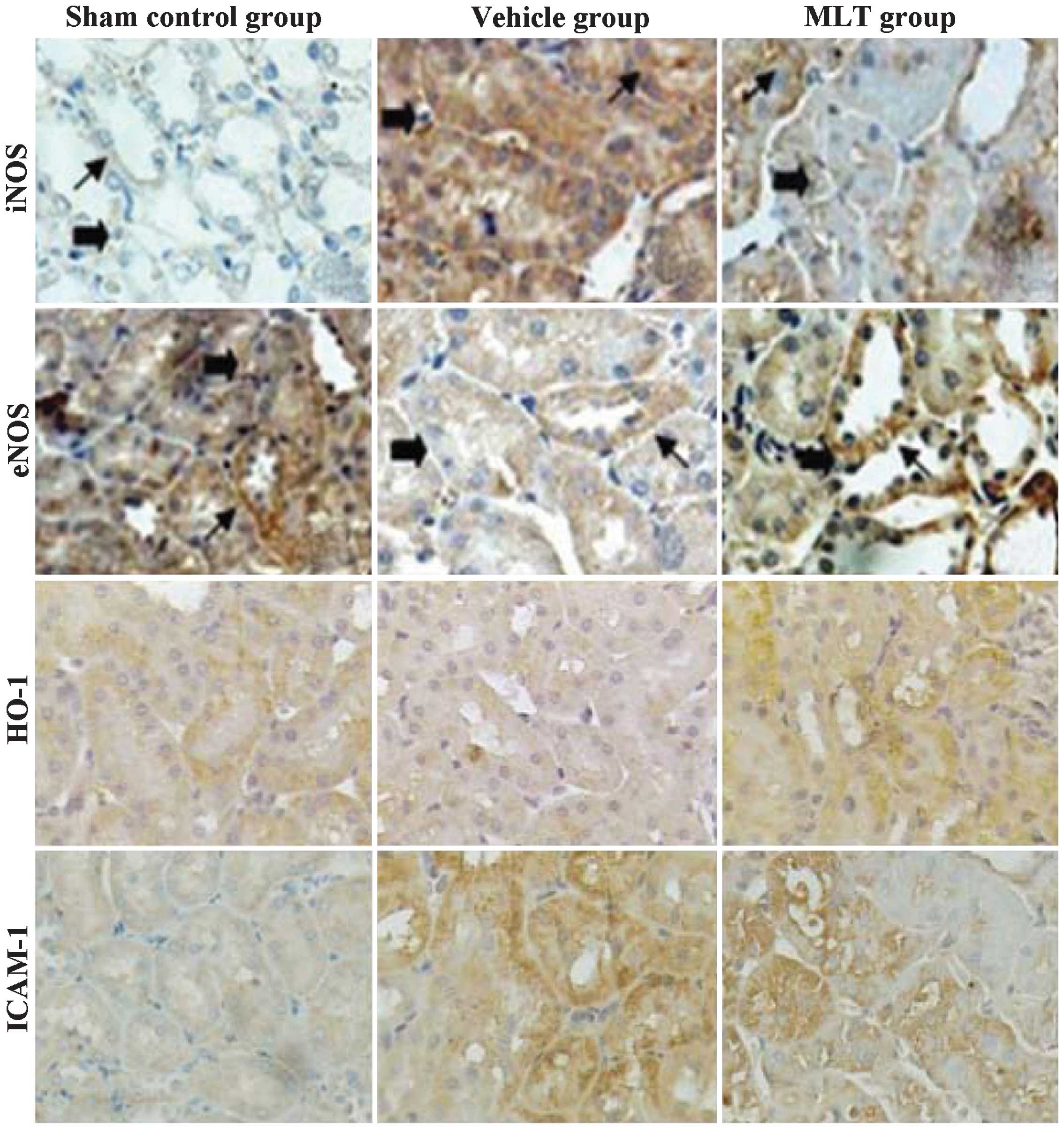Immunohistochemical analysis showed that iNOS, eNOS, HO-1 and ICAM-1 were mainly expressed in the cytoplasm of the renal tubular epithelial cells (Fig. 4). A minority of iNOS protein was detected in the nuclei as well. In addition, ICAM-1 was also detected in renal parenchyma. In the sham control group, the expression of ICAM-1 and iNOS was weakly positive; however, their expression was enhanced in the hypertensive rats. Compared with the vehicle group, the expression of iNOS and ICAM-1 was significantly attenuated in the MLT group. The expression of HO-1 and eNOS was significantly decreased in the vehicle group compared with that in the sham control group. However, in the rats treated with MLT, the expression of HO-1 and eNOS was significantly increased compared with that in the vehicle group. In parallel with the protein expression of iNOS, eNOS, HO-1 and ICAM-1, RT-PCR showed the same effects of hypertension and MLT treatment on the associated mRNA expression levels (Fig. 5): iNOS and ICAM-1 mRNA was elevated in the hypertensive rats compared with that in the animals of the sham control group, while these increases were attenuated by treatment with MLT. With regard to the mRNA expression of HO-1 and eNOS, a significant decrease was observed in the hypertensive rats, which was rescued by MLT treatment (P<0.01).