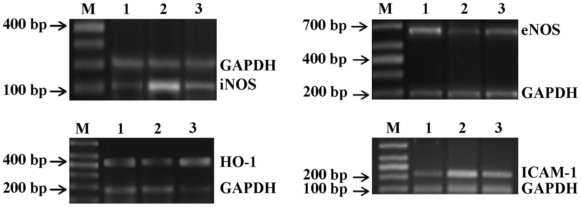 In the present study, the mRNA expression of heme oxygenase-1 (HO-1), intercellular adhesion molecule-1 (ICAM-1), inducible nitric oxide synthase (iNOS) and endothelial nitric oxide synthase (eNOS) was determined using RT-PCR amplification. Total RNA was extracted using TRIzol reagent TRIzol (Invitrogen Life Technologies, Shanghai, China). according to the manufacturer's instructions. The first-strand cDNA was synthesized with a random primer (Sangon Biotech Co., Ltd., Shanghai, China) using the SuperScript III reverse transcriptase (Invitrogen Life Technologies, Carlsbad, CA, USA). PCR amplification was performed using the primers and amplification conditions listed in Table I. GAPDH was amplified under the same reaction conditions, accordingly, to serve as the internal standard. Finally, the PCR products were electrophoresed on 1.5% agarose gels and analyzed using a Gel Documentation E-Gel® Imager system (Invitrogen Life Technologies).