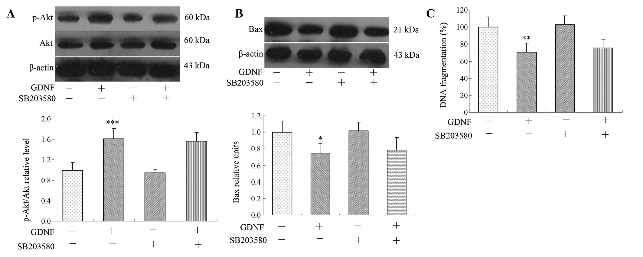 Intracellular signaling pathways, including P38 MAPK and PI3K/Akt signaling pathways were involved in the regulation of cell survival. It was then investigated whether GDNF administration enhanced the activation of the PI3K/Akt pathway. GDNF-induced upregulation of p-Akt/Akt was reversed by treatment with the PI3K/Akt inhibitor Wortmannin, which is a specific inhibitor of PI3K in the nanomolar range (36) and 2.5 µM Wortmannin has been shown to inhibit the expression of long-term potentiation in the dentate gyrus of rats (37). In addition, the PI3K/Akt inhibitor, Wortmannin also inhibited the GDNF-decrease of Bax and DNA fragmentation. However, treatment of diabetic rats with the p38 MAPK inhibitor SB203580 did not abolish the GDNF-mediated increase of p-Akt and the decrease of Bax and DNA fragmentation. PI3K/Akt is the only enzyme known to be inhibited by Wortmannin (38), which suggests that GDNF has the ability to reduce the level of Bax and the expression of DNA fragmentation is dependent on the activation of the PI3K/Akt pathway.