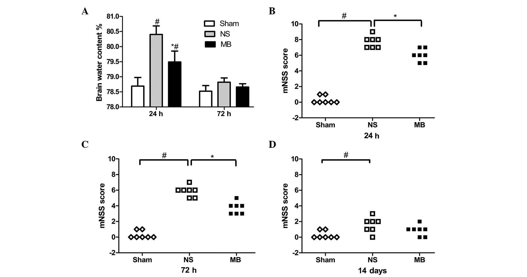 The modified neurological severity score (mNSS) was used to examine the effects of MB on neurological deficits at all time-points following TBI. Neurological function was graded on a scale of 0–18, as previously described (Table I) (16).