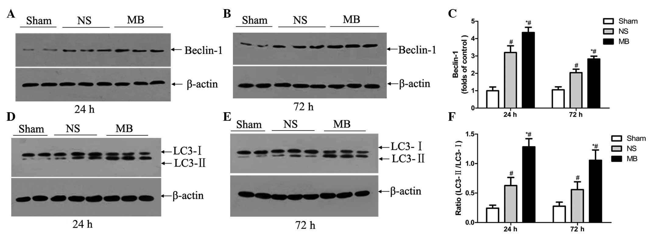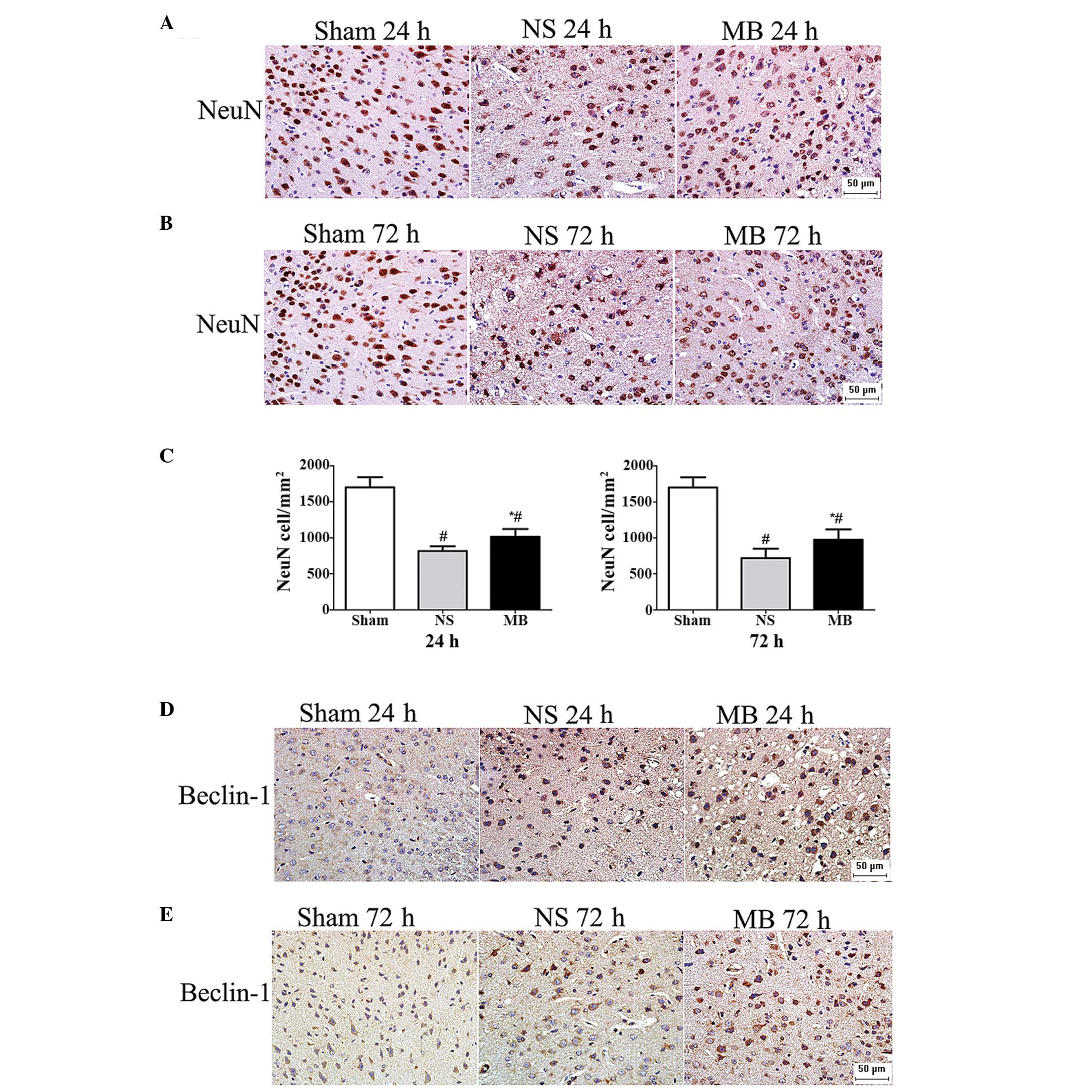 Autophagy degrades long-lived stable proteins, and entire organelles can be recycled under stress conditions or during development (37). Autophagy is important for homeo-stasis and serves as a cellular mechanism for eliminating destructive organelles and recycling components for reuse. Diskin et al (38) first reported in 2005, that TBI may stimulate autophagy. Using a mouse model of closed head injury, Beclin 1, required for initiating autophagy, was observed to increase in the neurons and activated astrocytes at the site of injury, providing indirect evidence that autophagy is increased following TBI. The effects of rapamycin, an inducer of autophagy, has been assessed in the same model, revealing that the increase in autophagy produced beneficial neurological effects and increased the numbers of surviving neurons at the site of injury (39). In the present study, upregulation of Beclin 1 and an increased LC3-II/LC3-I ratio was observed 24 and 72 h post-TBI in the MB- and vehicle-treated mice, indicating the activation of autophagy. However, the difference between the two groups was statistically significant, as were the number of surviving neuron numbers in the MB group. These data indicated that MB intervention promoted autophagy and may assist in preventing neuronal death following TBI. To date, few studies have focused on the association between MB and autophagy. Using cell models and organotypic brain slice cultures from a mouse model of frontotemporal dementia, Congdon et al (20) confirmed that MB alters the expression levels of LC3-II, Beclin 1 and p62, suggesting that MB is a potent inducer of autophagy. Wang et al (40) reported that MB inhibits the activity of heat shock protein 70 prior to promoting autophagy. The present study demonstrated that MB promotedautophagy in the CCI model of TBI. This is the first report, to the best of our knowledge, to demonstrate the effect of MB on autophagy in TBI, however, the specific mechanism remains to be elucidated.