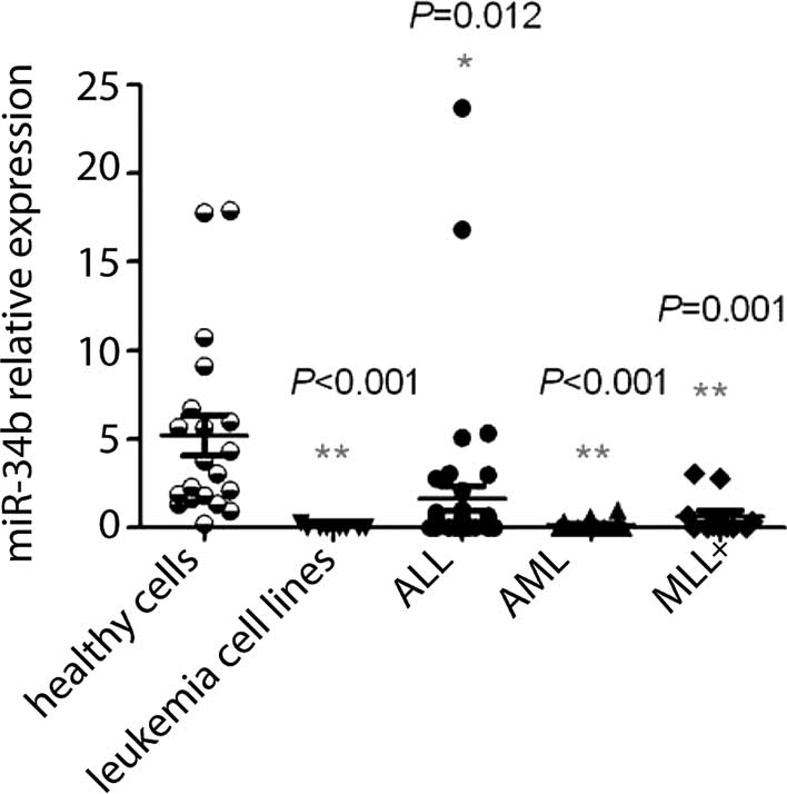 Clinical significance of microRNA‑34b expression in pediatric acute leukemia