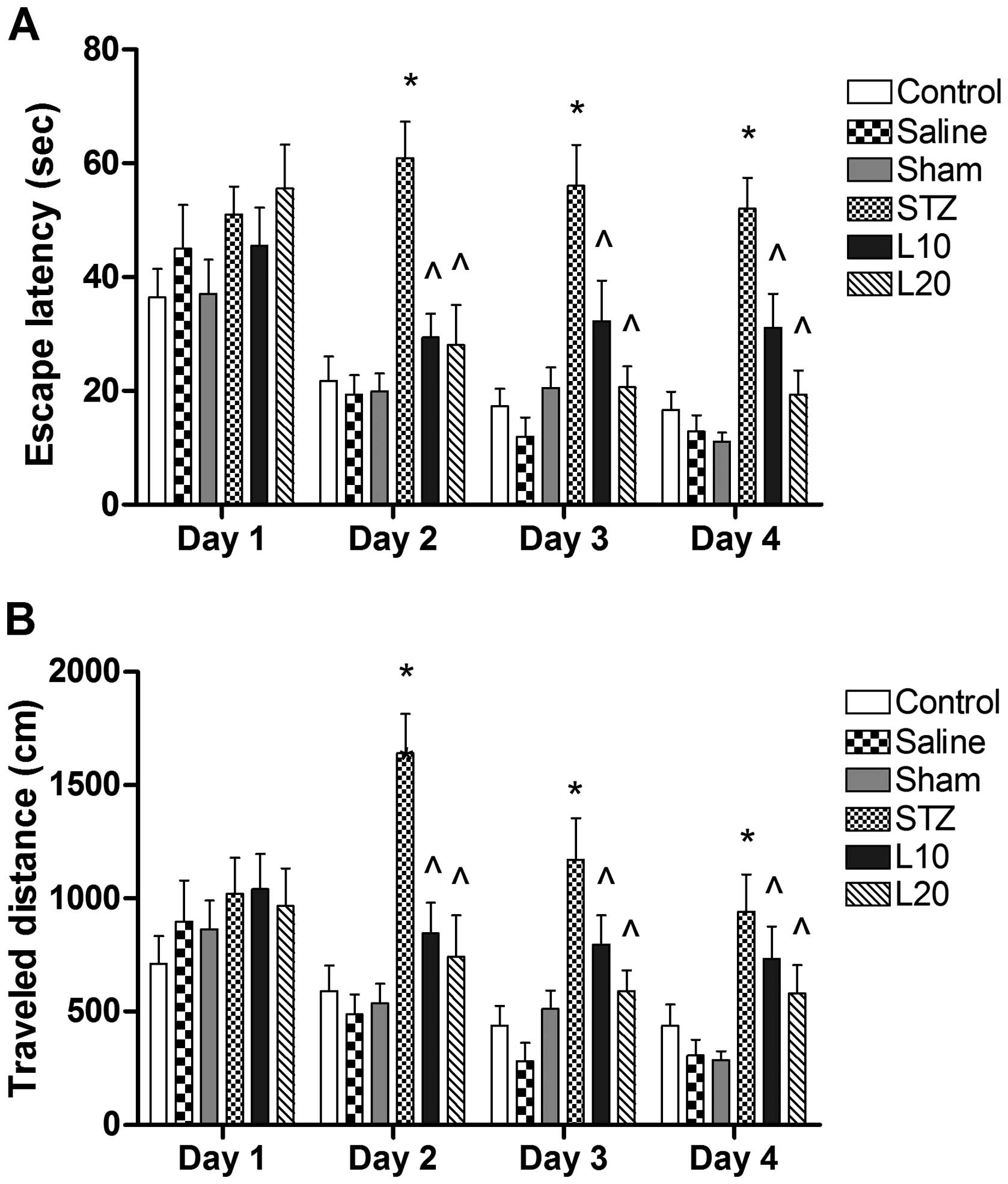 The Morris water maze consists of a circular water tank with 160 cm diameter and 60 cm height, filled with non-toxic water (25±2°C) to a depth of 25 cm. The pool was divided into 4 quadrants (North, South, East and West) which were used as start points. An escape platform (10 cm in diameter) made of plexiglass was placed in the middle of one of the randomly selected quadrants of the pool, 1 cm below the surface of water and kept in the same position throughout the entire experiment (North-West for this study). Spatial learning of animals was tested 14 days after STZ infusion in the Morris water maze. The rats in each group were tested (one at a time). The rats were trained for four days prior to the formal experiments. Each rat was subjected to 4 consecutive trials on each day with an interval of 1 min.