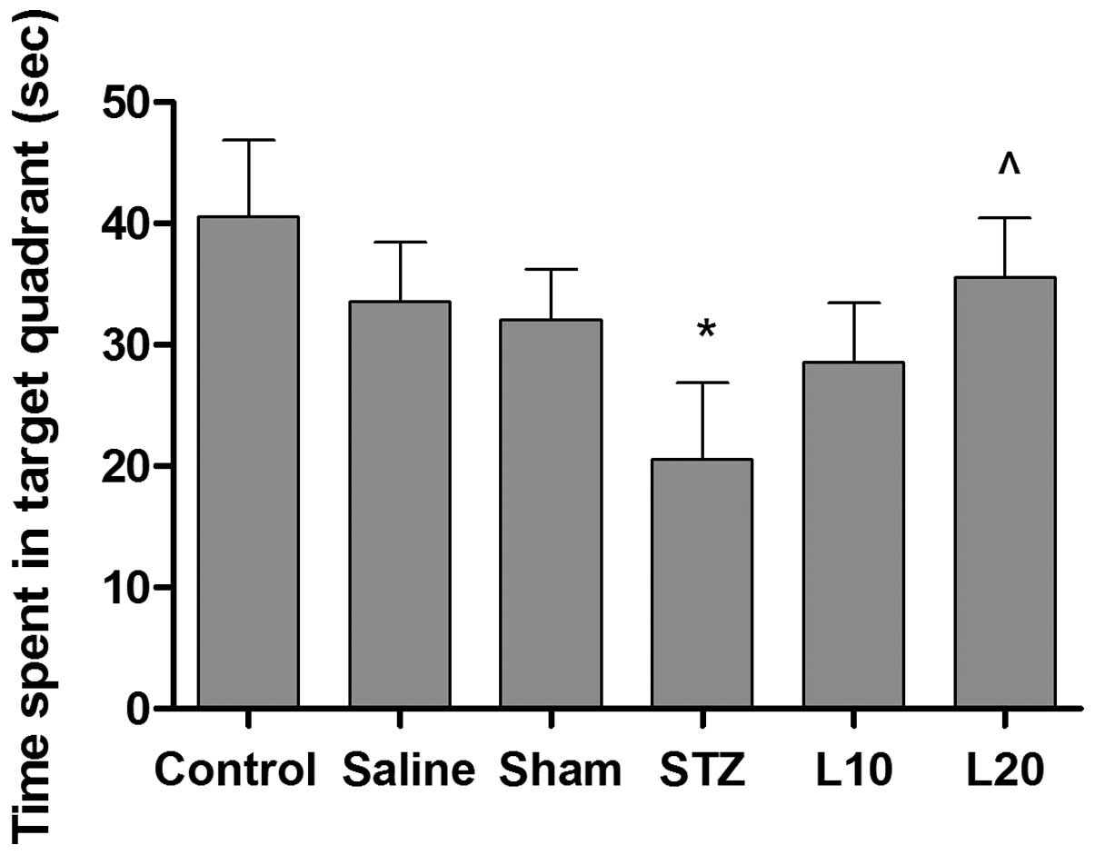 To examine the learning ability and consolidation of the platform location during the training, a probe test was performed. As shown in Fig. 3, animals in different groups showed a significant different performance. The time spent in the target quadrant was significantly lower in the STZ rats as compared to the sham group. STZ rats treated with luteolin (10 and 20 mg/kg) spent more time in the target quadrant than the monotherapy group in the probe test. In particular, STZ-treated rats with luteolin at a dose of 20 mg/kg spent significantly more time in the target quadrant compared with STZ-treated rats (P<0.05).