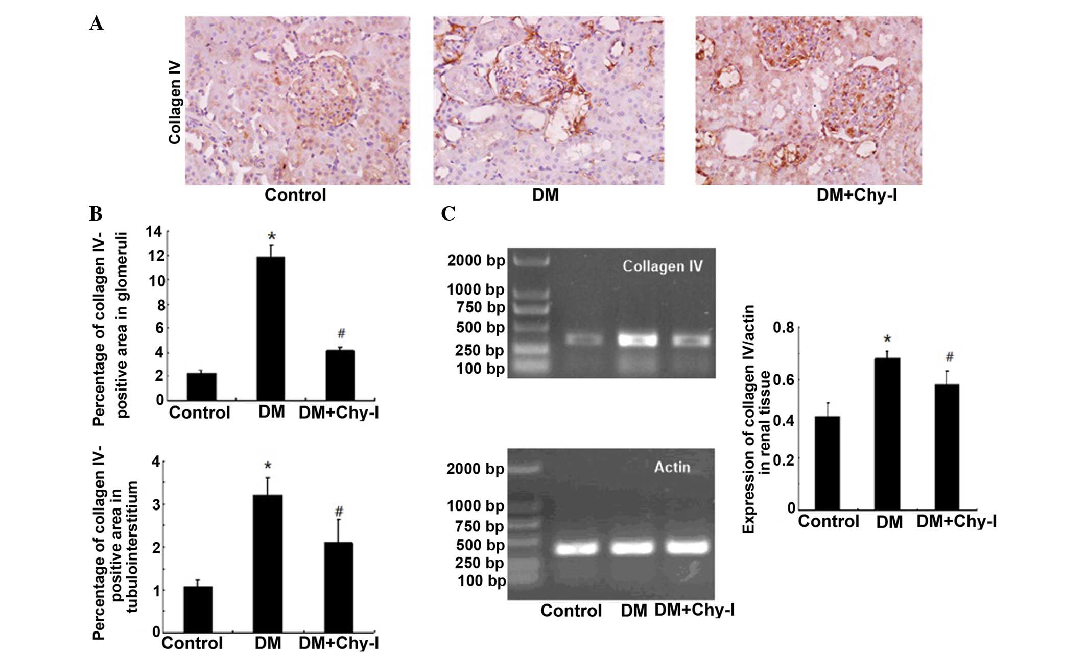 The present study investigated the expression of FN and ColIV, which are two typical markers of diabetic renal injury. Immunohistochemical analysis revealed that the protein expression of FN was significantly increased in glomeruli and at the renal tubulointerstitium in diabetic rats, as compared with in the control rats (2.49-fold increase in glomeruli and 4.98-fold increase in tubulointerstitium). However, in the DM + Chy-I group, the intensity of FN staining was markedly decreased in these regions (by 55.15% in glomeruli and 50.59% in tubulointerstitium) (Fig. 1A and B). RT-PCR was also performed to detect FN gene expression in the various groups (Fig. 1C). Compared with in the normal control group, FN expression exhibited a 2.45-fold increase in the DM group, whereas chymase inhibition reduced FN expression by 25.35%. These results indicate that chymase inhibition may limit the expression of ECM components.