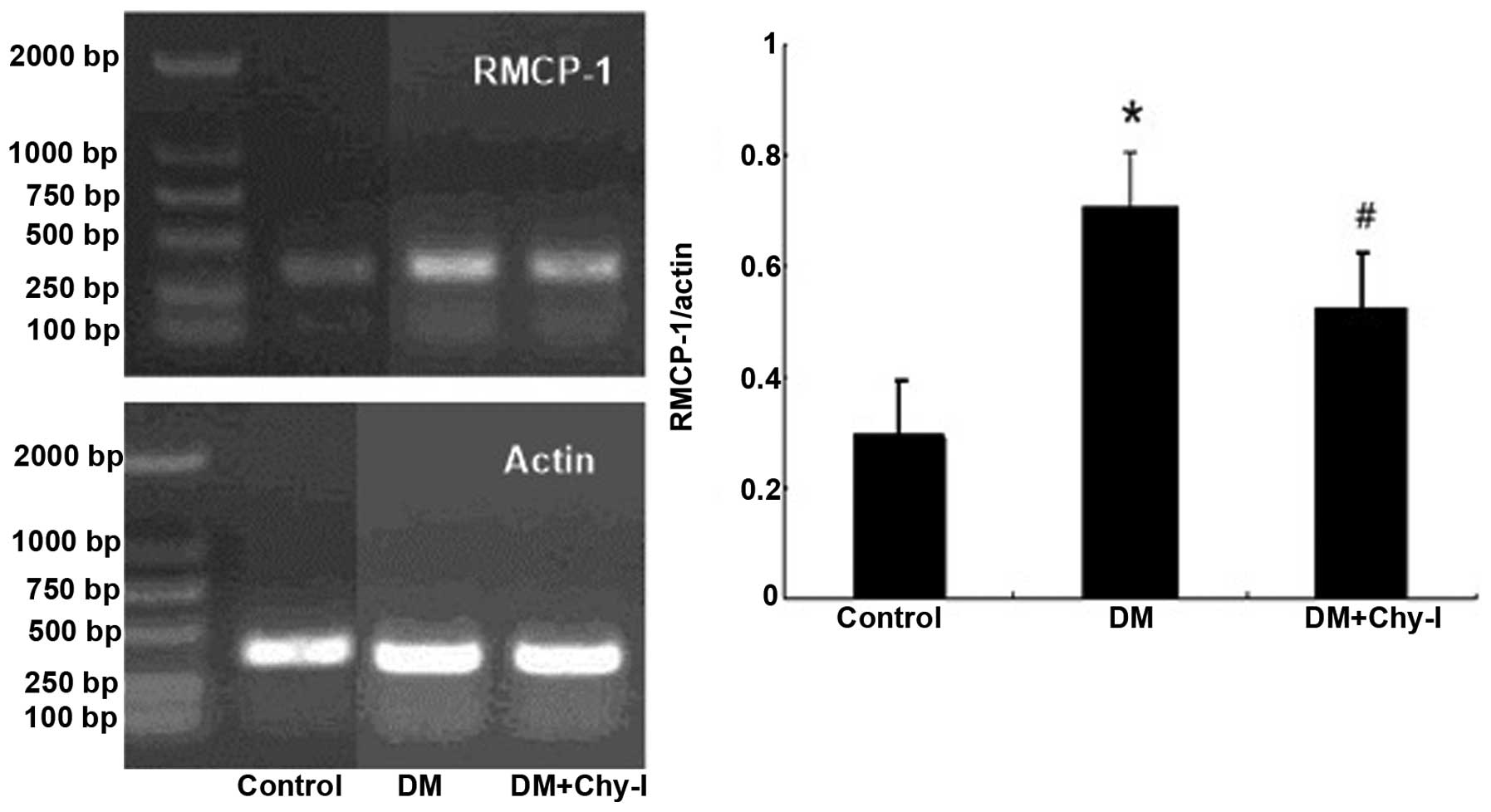 The expression levels of RMCP-1 were significantly higher in the diabetic renal tissues compared with in the normal renal tissues, as revealed by RT-PCR (0.288±0.026 vs. 0.709±0.054; P<0.01). Furthermore, treatment with a chymase inhibitor reduced the expression levels of RMCP-1 (Fig. 3).