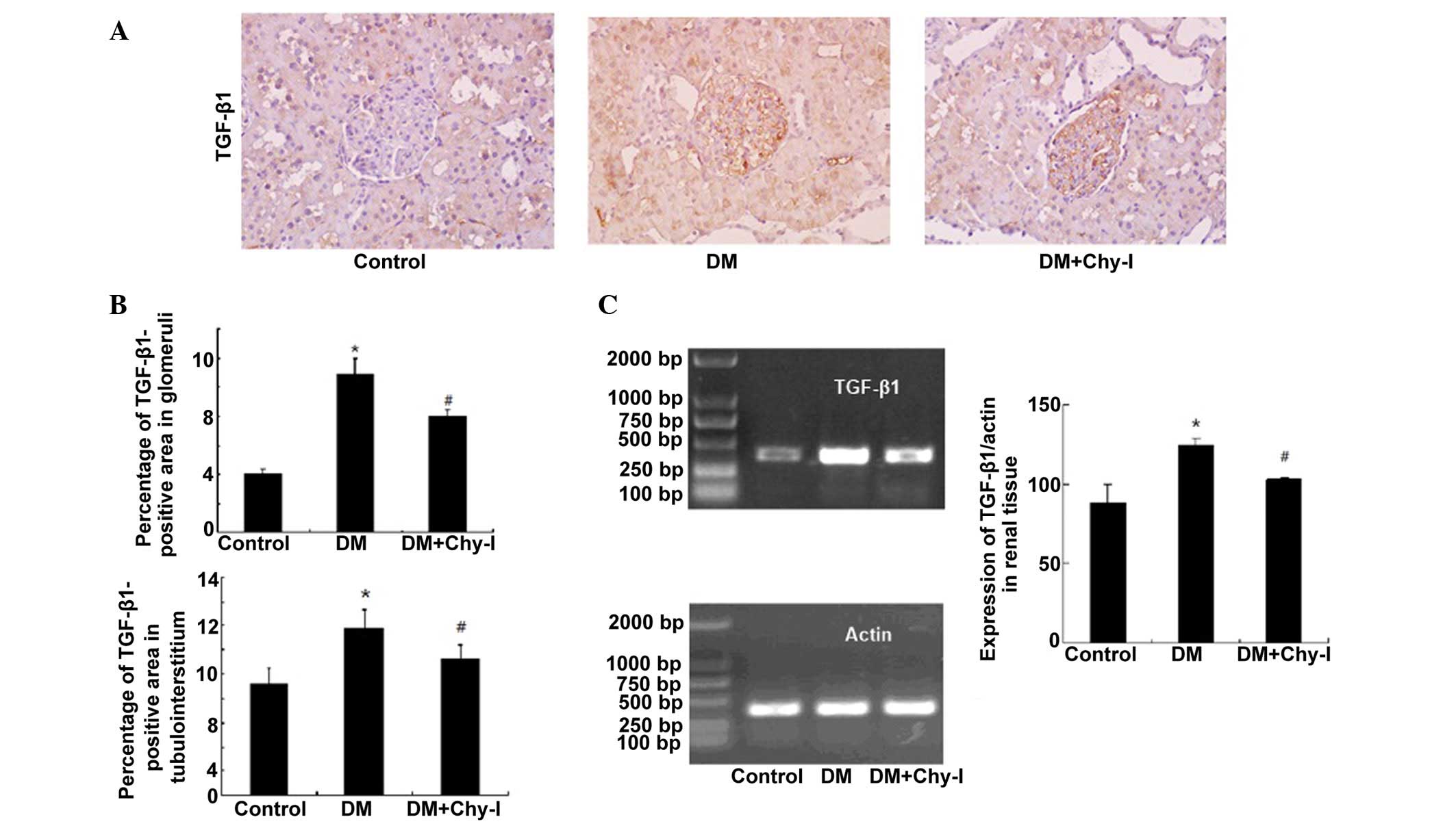 Immunohistochemical analysis revealed that TGF-β1 was upregulated in the glomerular mesangium and tubular cells of the diabetic rats (2.69-fold increase in glomeruli and 1.51-fold increase in tubulointerstitium) (Fig. 5A and B). Conversely, chymase inhibition reversed the overexpression of TGF-β1 in diabetic rats (to 73.43% in glomeruli and to 81.36% in tubulointerstitium). RT-PCR analysis revealed that the renal tissues from the DM group exhibited increased TGF-β1 mRNA expression, as compared with the control rats (82.22±11.35 vs. 124.15±4.32; P<0.05), whereas chymase inhibition reduced the expression of TGF-β1 in diabetic renal tissues (124.15±4.32 vs. 103.07± 6.30; P<0.05) (Fig. 5C).