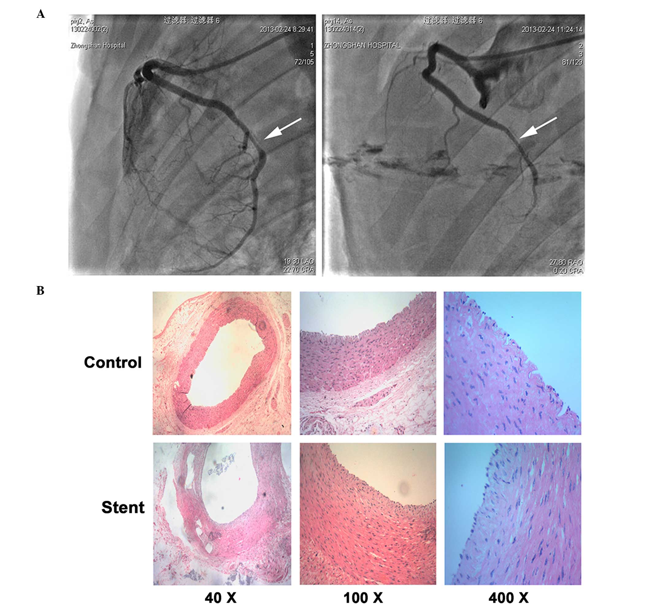 All animal procedures were approved by the Animal Care Committee of the East Hospital at Tongji University. A total of 15 pigs Shanghai White pigs (gender, 6 female and 9 male; age range, 3–4 months; weight, 35–40 kg) were purchased from Shanghai Animal Administration Center. The stent implantation procedure was performed in the Zhongshan Hospital (Zhongshan, China). Bare metal stents [MicroPort NeuroTech (Shanghai) Co., Ltd., Shanghai, China] were implanted into the right anterior descending coronary artery, left anterior descending artery or left circumflex artery of 3-month-old pigs (n=5 per group). Pigs with restenosis were confirmed by coronary angiography (15) 1 month subsequent to stent placement, and were sacrificed subsequent to anesthesia. Restenosis coronary artery samples were then collected for histology or SMC isolation from the tunica media. Control 3-month-old pigs were sacrificed by an intravenous injection of KCl following anesthesia with ketamine and diazepam. Subsequently, the anterior descending, circumflex and right coronary arteries were separated. Tunica media cells were isolated from the arteries and cultured.