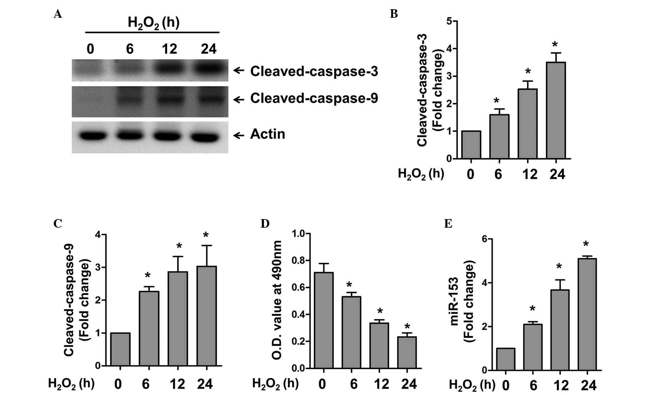 The present study first examined the expression level of miR-153 under oxidative stress. The cardiomyocytes were treated with H2O2 for different time periods to induce apoptosis in the cardiomyocytes. Using western blot analysis, H2O2 was found to induce caspase-3 and 9 activation in a time-dependent manner (Fig. 1A–C). Accordingly, a significant decrease in cell viability was observed under these conditions, as revealed by the MTT assay (Fig. 1D). RT-qPCR was used to detect the expression of miR-153 at various time points. In accordance with the expression of the apoptotic markers, caspase-3 and 9, miR-153 was also upregulated in a time-dependent manner. These results confirmed the successful establishment of an apoptotic model in the cardiomyocytes, and indicated that miR-153 may be involved in oxidative stress-induced apoptosis.