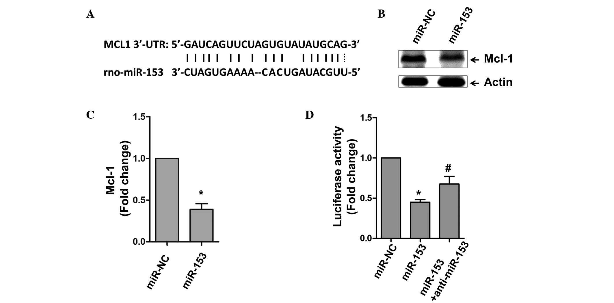 miRs commonly function to repress gene expression by binding to the 3′UTR region of mRNA. Using bioinformatical alignment, the present study identified a potential binding site within the 3′UTR of Mcl-1 (Fig. 3A). Whether this predicted region is actually targeted by miR-153 was then assessed. The cardiomyocytes were transfected with miR-153, and it was found that the expression of Mcl-1 was significantly inhibited, compared with the NC group of cells (Fig. 3B and C). A luciferase assay was also used to examine the association between Mcl-1 and miR-153. As shown in Fig. 3D, the overexpression of miR-153 markedly inhibited luciferase activity, and anti-miR-153 rescued the inhibitory effect of miR-153 on luciferase activity.