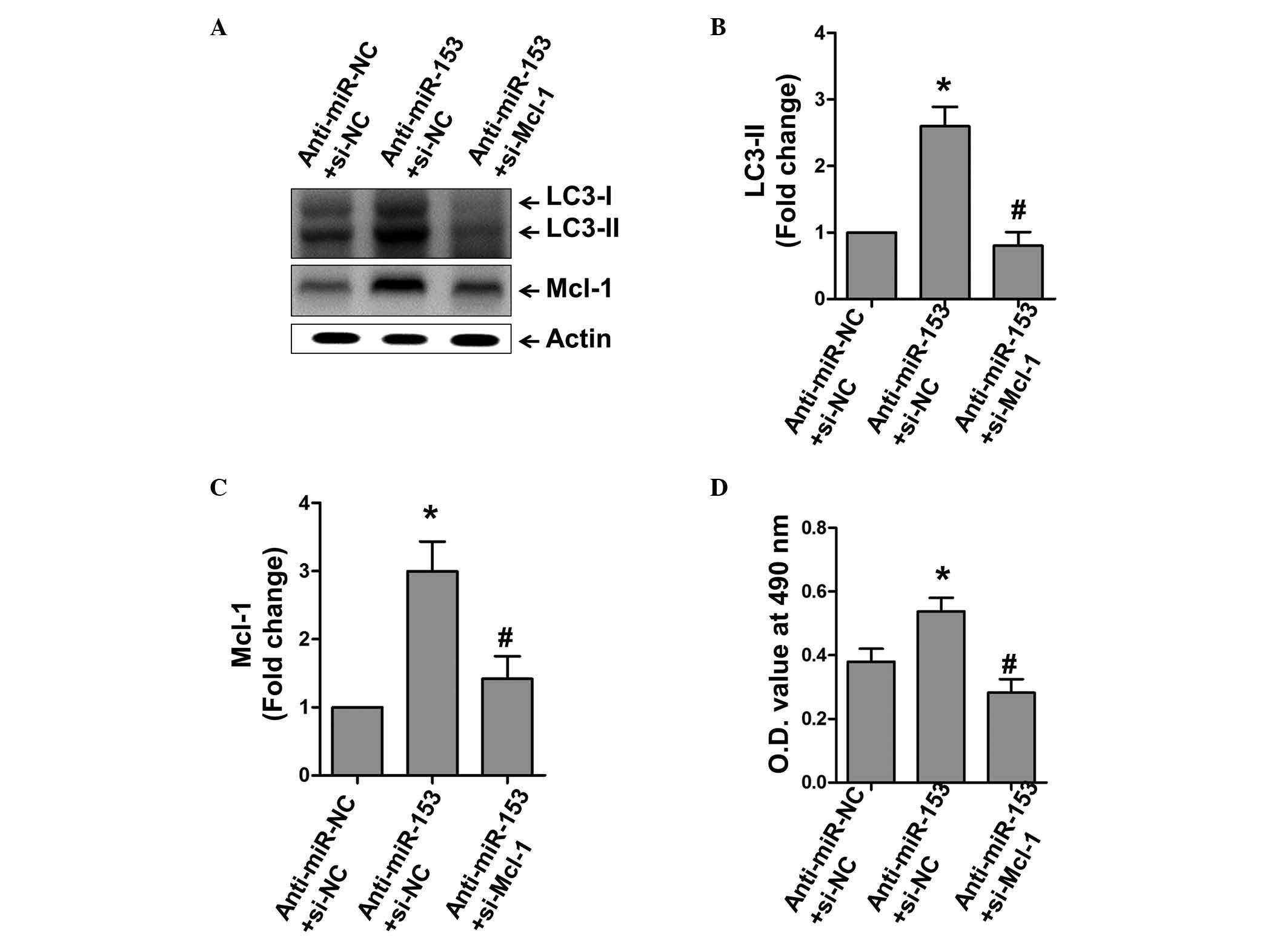 In conclusion, the present study demonstrated the key role of miR-153 in oxidative stress-induced apoptosis. Mcl-1 was identified as a novel target, through which miR-153 regulated essential programs, including apoptosis and autophagy. These results may provide novel clues for understanding the control by miRs of multiple effects under certain stresses. The results of the present study may also guide the development of novel therapies for cardiac syndromes.
