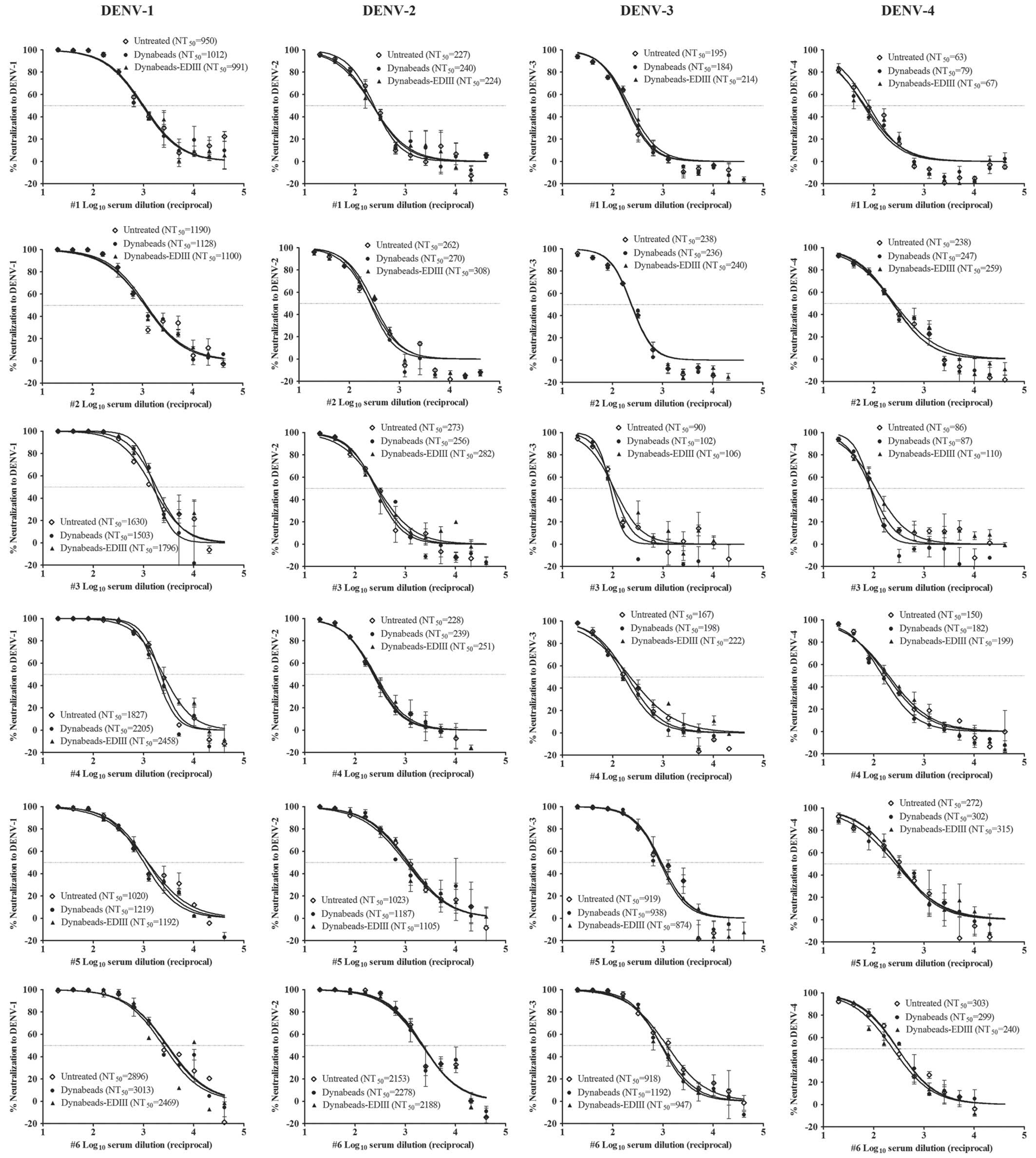 The EDIII-reactive antibodies can function as effective neutralizers and also may possess varying degrees of enhancing activity (12–19). Recent studies have revealed that these antibodies from virus-infected serum are considered to contribute little to neutralizing and enhancing activities (11,20–22). Thus, it could be presumed that antibodies from patient sera are induced by a number of different epitopes on complex DENV in vivo, and not all protective epitopes can serve as predominant epitopes to provoke an effective neutralizing antibody response or ADE; however, protective non-predominant epitopes may serve as purified subunit vaccine candidates to induce a protective response. Additionally, the majority of research on the role of EDIII-reactive antibodies of human convalescent serum focused on DENV-2 and DENV-3 infections (11,22), however, >60% of patients with dengue in southern China have DENV-1 infection. In this study, therefore, neutralization and ADE activity as well as the EDIII-binding antibody titre on homotypic and heterotypic DENVs in human DENV-1-infected sera and rabbit antiserum immunized with recombinant EDIII protein were evaluated. Furthermore, the contribution of EDIII-reactive antibodies was verified by depleting EDIII-reactive antibodies from human sera and rabbit antiserum using Dynabead-EDIII conjugates.