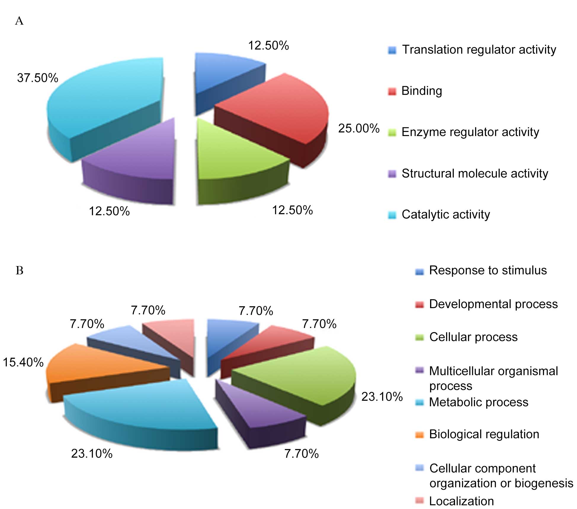 Bioinformatics analysis was performed to categorize proteins based on the biological process, cellular component and molecular function using annotations in Protein Analysis Through Evolutionary Relationships (PANTHER) database version 6.1 (www.pantherdb.org) (14), which is in compliance with gene ontology (GO) standards. Signaling pathway analysis was performed with the tools on the Kyoto Encyclopedia of Genes and Genome (KEGG) database (www.genome.jp/kegg/pathway.html).