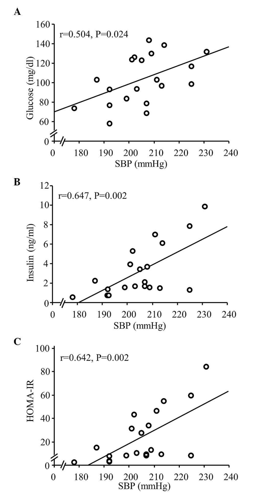 Our previous study (15) reported that FBG levels were significantly higher in the HS group, compared with the normal-salt group. The present study examined the effect of antihypertensive therapy on IR in SHRs fed a CDAA diet. Serum levels of glucose and insulin, and HOMA-IR were significantly correlated with SBP among the rats fed either a normal-salt or HS CDAA diet (Fig. 4), however, the CDAA diet did not affect these levels in the SHRs (control, vs. CDAA; Fig. 5). In addition, HS increased HOMA-IR in the SHRs fed a CDAA diet, indicating IR (Fig. 5C). Of note, treatment with the antihypertensive agents, Aml and Hyd, caused a significant decrease in serum levels of glucose and insulin (Fig. 5A and B), and significantly ameliorated HOMA-IR (Fig. 5C).