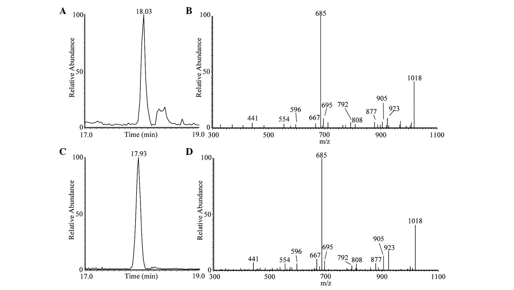 Wang J, Liu J, Wang X, Yao J and Yu Z: Application of electrospray ionization mass spectrometry in rapid typing of fengycin homologues produced by Bacillus subtilis. Lett Appl Microbiol. 39:98–102. 2004. View Article : Google Scholar : PubMed/NCBI | |