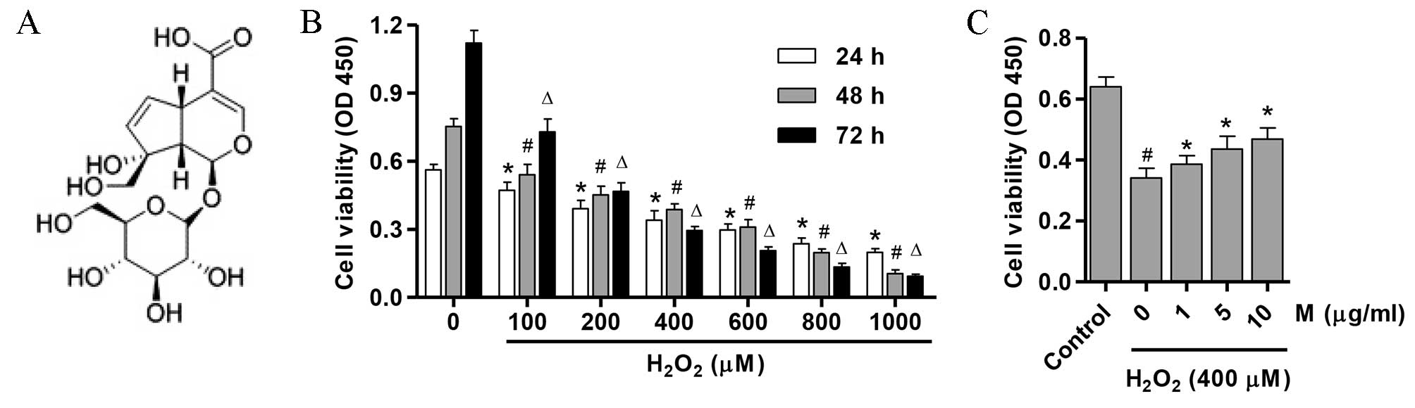 Osteoblast viability was evaluated using the 3-(4,5-dimethylthiazol-2-yl)-2,5-diphenyltetrazolium bromide (MTT) assay as described previously (20). In brief, cells (5×104 cells/ml) were first seeded in 96-well culture plates and treated with or without H2O2, in the absence or presence of monotropein (1, 5 or 10 µg/ml) for 24, 48 and 72 h. Cell viability was subsequently evaluated using an MTT Cell Proliferation assay kit (cat. no. 4890-025-K; Wuhan Amyjet Scientific Co., Ltd., Wuhan, China). The absorbance was measured at 490 nm with an automated Bio-Rad 550 microtiter plate reader (Bio-Rad Laboratories, Inc., Hercules, CA, USA).