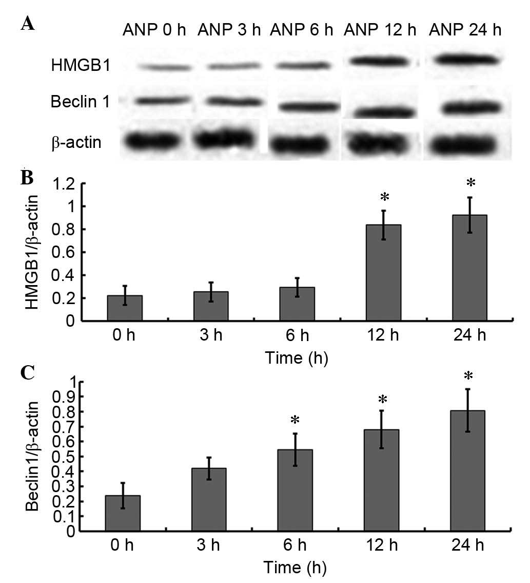 The exact expression pattern of HMGB1 during ANP development remains unknown. Therefore, the present study aimed to investigate the involvement of HMGB1 in the development of ANP, in order to explore the role of HMGB1 and the autophagy signal Beclin 1 in the development of ANP. The results of the present study may provide evidence regarding the treatment of ANP.