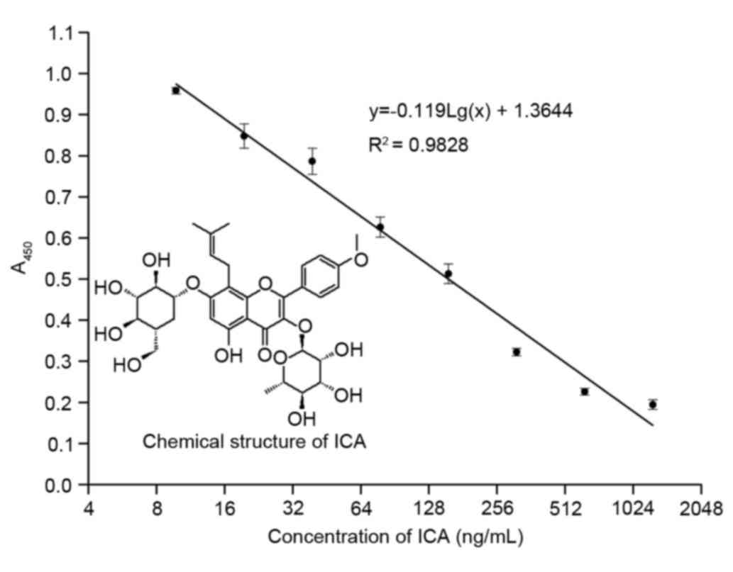 In the present study, the formation and characterization of an anti-ICA MAb were investigated, and an indirect competitive (ic)ELISA method was established. The MAb and icELISA were used to detect ICA in the complex chemical constituents of TCM. This icELISA method may be of use for further investigations of ICA.