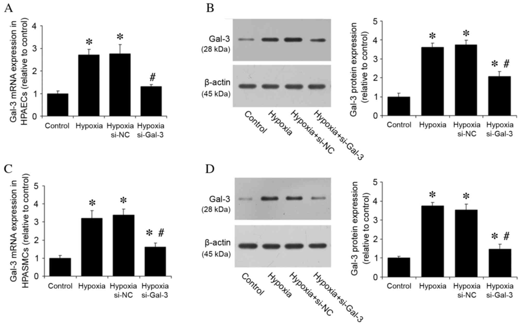 The effect of hypoxia on Gal-3 expression was then investigated in vitro. Gal-3 mRNA and protein expression levels were detected in HPAECs and HPASMCs cultured under normoxic and hypoxic conditions. HPAECs and HPASMCs were also transfected with si-Gal-3 siRNA to inhibit Gal-3 expression and si-NC, and cultured under hypoxic conditions. Compared with the normoxic control group, hypoxia significantly increased Gal-3 mRNA and protein expression levels in untransfected cells (P<0.05; Fig. 2), whereas hypoxic cells transfected with si-Gal-3 demonstrated significantly reduced levels of Gal-3 mRNA and protein expression compared with untransfected hypoxic cells (P<0.05; Fig. 2).