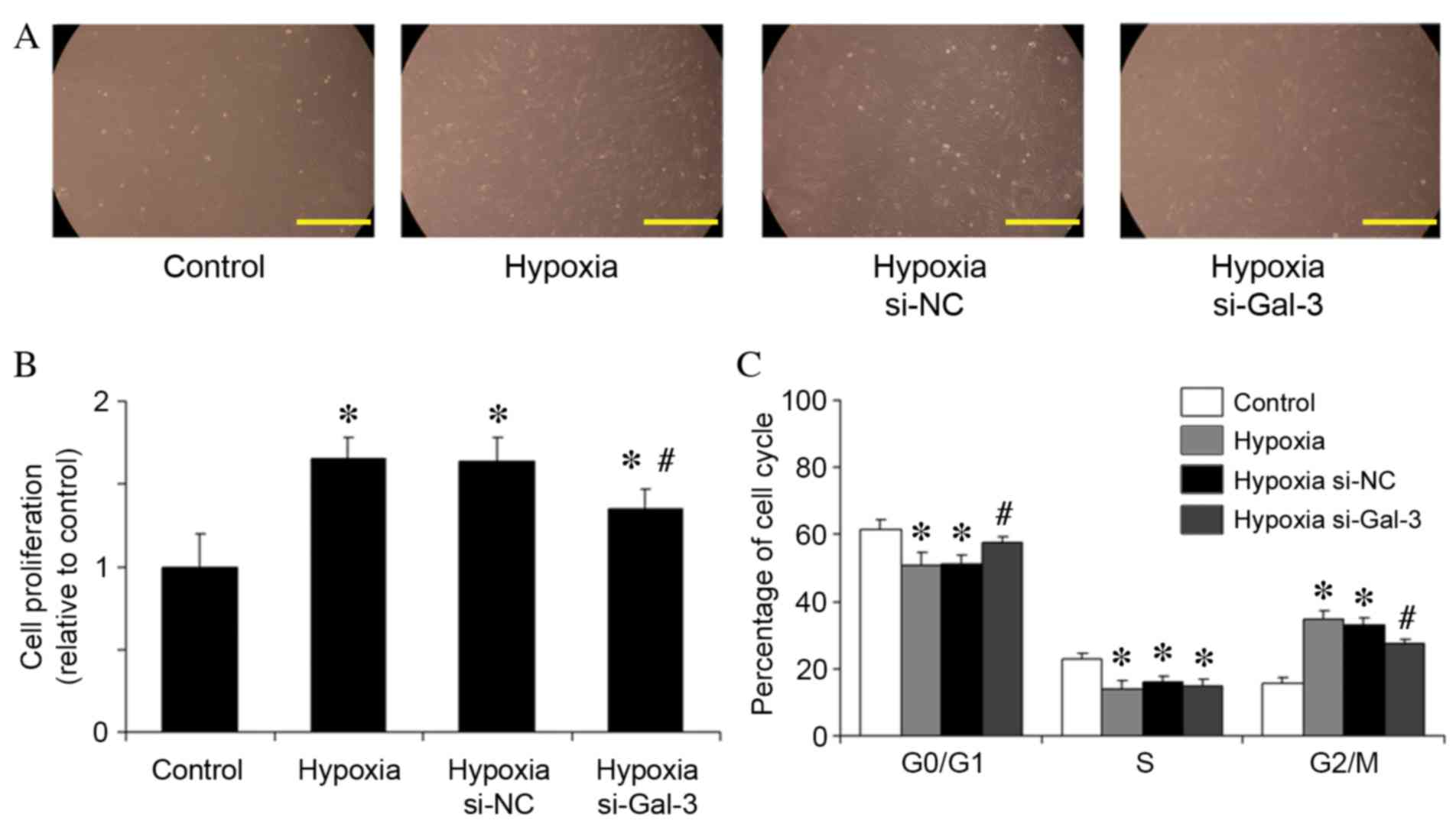 Following 48 h of hypoxic stimulation of HPASMCs, cells were harvested and counted using a hemocytometer (Fig. 4A). The mean number of viable HPASMCs in the hypoxia group was 1.65-fold higher than that in the normoxic control group (P=0.002; Fig. 4B). However, Gal-3 inhibition in hypoxic cells significantly reduced the mean number of viable HPASMCs compared with untransfected hypoxic cells (P=0.019; Fig. 4B).