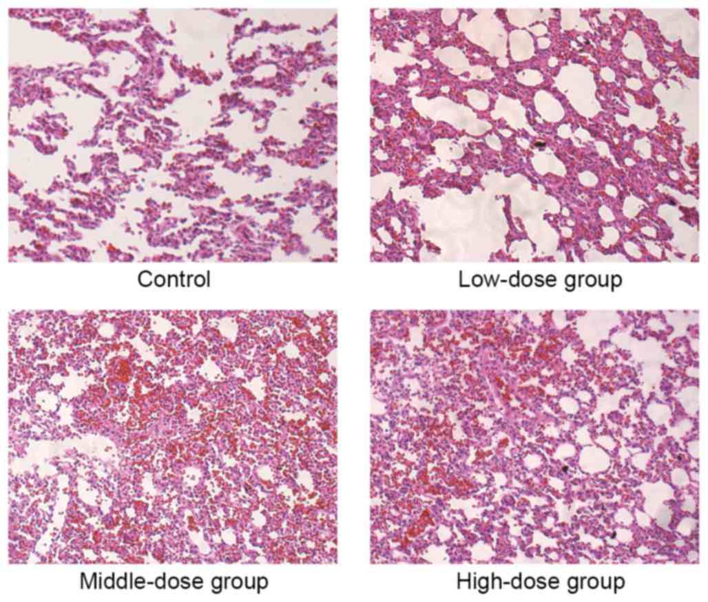 The H&E staining revealed that the alveolar wall of the middle- and high-dose group was thickened and exhibited mild fibrosis, and red blood cells leaked from the alveolar cavity (Fig. 5). The Prussian blue staining demonstrated that blue particles in the middle- and high-dose group were scattered inside the lungs, that the particles aggregated in lungs and were engulfed by pulmonary phagocytes, and inflammatory reactions existed around the lungs (Fig. 6). The control group and the low-dose group demonstrated no abnormalities. The remaining organs exhibited no obvious abnormality.