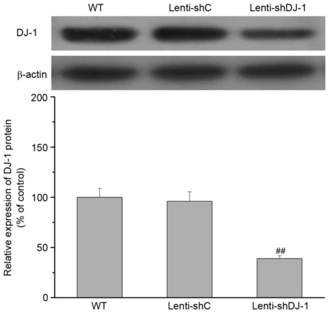 Anti-DJ-1 (N-20; catalog no. sc-27004) and anti-β-actin (I-19; catalog no. sc-1616) goat polyclonal primary antibodies, and the horseradish peroxidase-conjugated rabbit anti-goat secondary antibody (catalog no. sc-2768) were purchased from Santa Cruz Biotechnology, Inc. (Dallas, TX, USA). Dihydroethidium (DHE) was obtained from Molecular Probes; Thermo Fisher Scientific, Inc. (Waltham, MA, USA). Malondialdehyde (MDA), glutathione peroxidase (GPx), catalase (CAT) and superoxide dismutase (SOD) assay kits were purchased from Beijing Solarbio Science & Technology Co., Ltd. (Beijing, China). All other chemicals were purchased from Sigma-Aldrich; Merck Millipore (Darmstadt, Germany) unless otherwise stated.