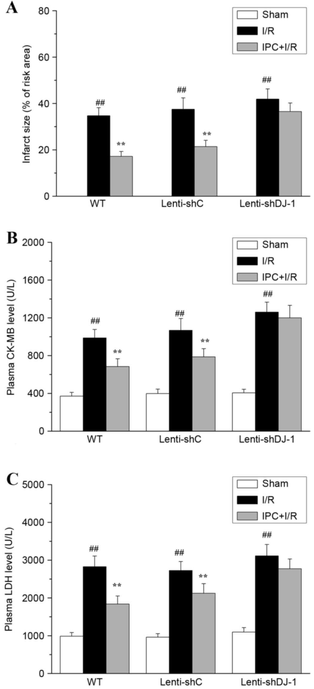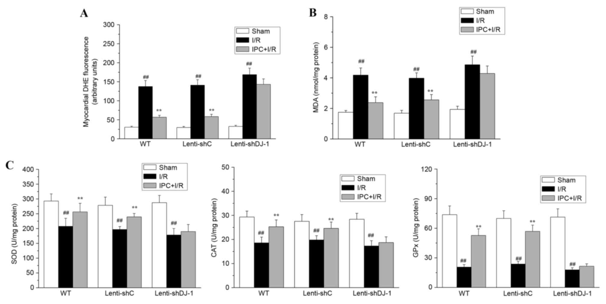 The aim of the second phase was to determine whether in situ knockdown of DJ-1 interferes with delayed cardioprotection induced by IPC against oxidative stress caused by I/R. Male Sprague-Dawley rats were randomly assigned to one of three experimental groups (n=15/group). Rats in group VII (WT) were untreated. Rats in group VIII (lenti-shC) received left intramyocardial injection of control virus lenti-shC. Rats in group IX (lenti-shDJ-1) received left intramyocardial injection of lenti-shDJ-1. A total of three weeks later, rats in each of these three experimental groups were randomly divided into three subgroups (n=5/group): i) Sham, in which rats underwent the surgical procedure without coronary occlusion; ii) I/R, in which rats were subjected to 30 min coronary occlusion followed by 120 min reperfusion; and iii) lPC + I/R, in which rats were preconditioned with a sequence of three cycles of 5-min coronary occlusion/5-min reperfusion 24 h prior to coronary I/R. Lactate dehydrogenase (LDH) and creatine kinase-MB (CK-MB) release, infarct size, cardiac function, CAT, SOD and GPx activities, MDA, and intracellular reactive oxygen species (ROS) were assessed following I/R. Rats were sacrificed immediately following I/R.