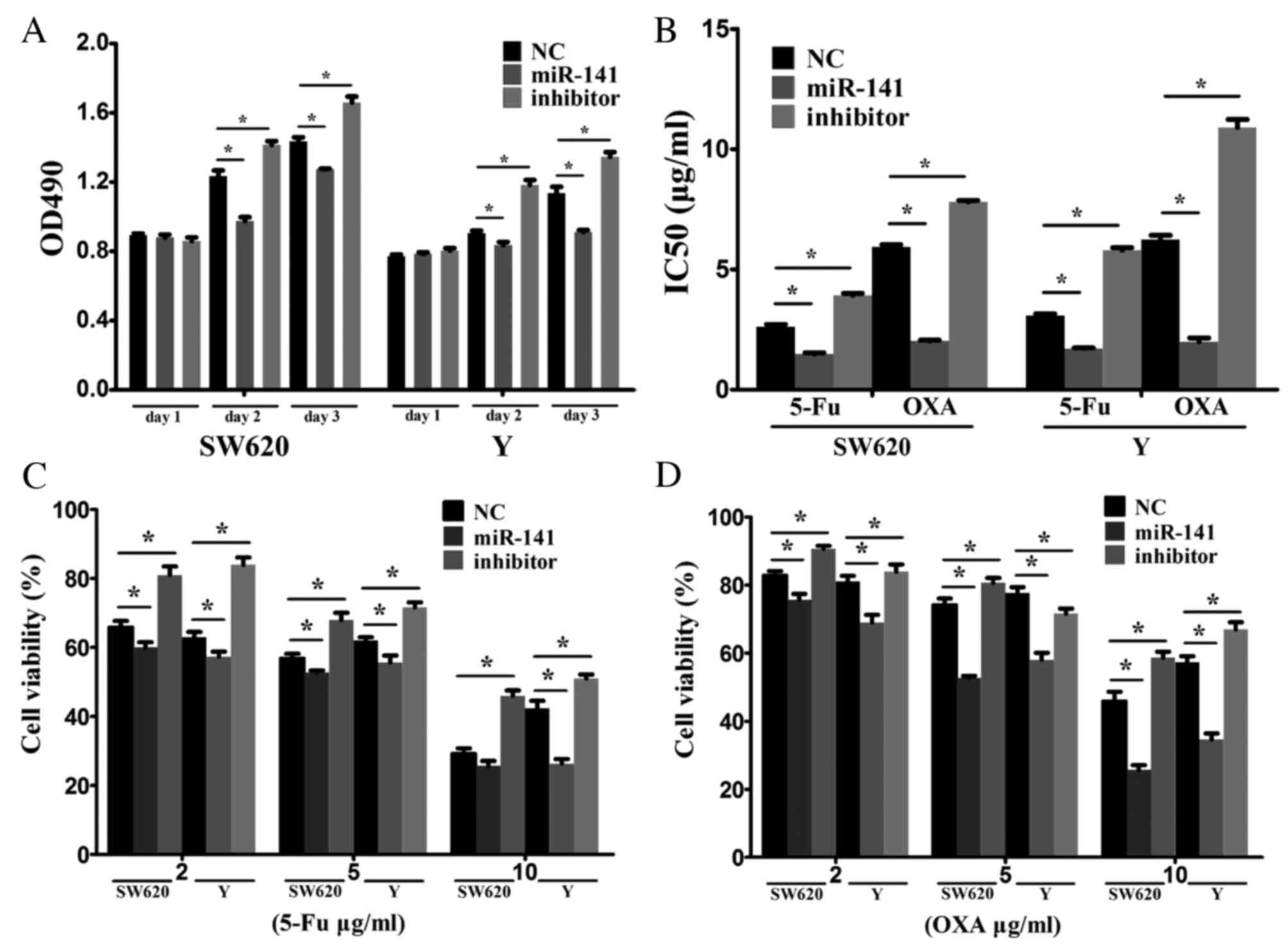 The effect of miR-141 on drug resistance was examined in vitro. 5-FU or oxaliplatin as typical antitumor drugs were added into the culture medium of SW620 and Y cells. Transfection with anti-miR-141 enhanced drug resistance (Fig. 2B). Following treatment of SW620 and Y cells with various concentrations (2, 5 or 10 ug/ml) of 5-FU (Fig. 2C) or oxaliplatin (Fig. 2D), cell viability was markedly reduced in the miR-141 mimic-transfected, compared with the negative control, group. Transfection with anti-miR-141 demonstrated the opposite effect. These results indicated that miR-141 suppresses CRC proliferation and enhances drug sensitivity.