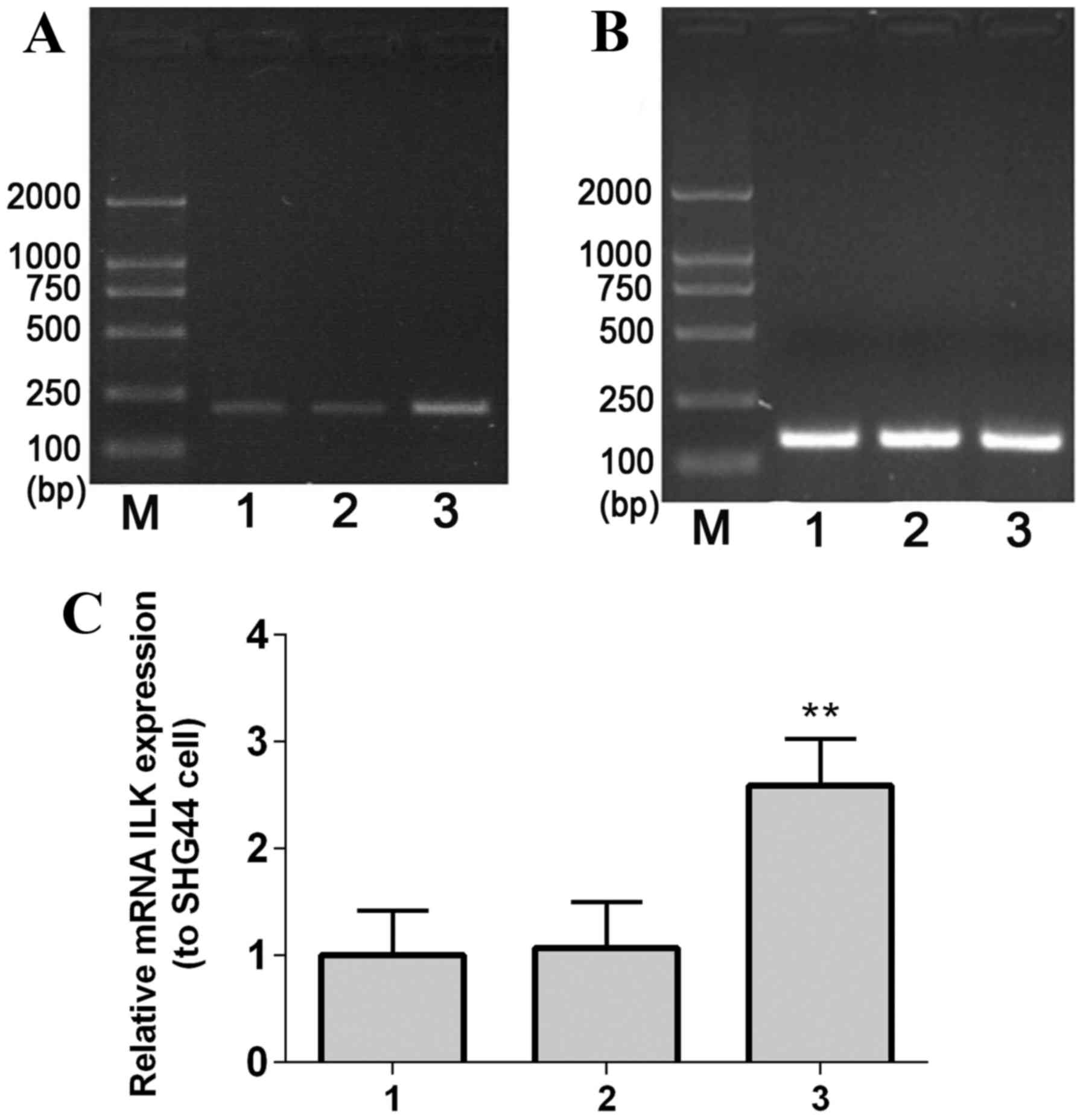 RT-PCR results demonstrated that ILK mRNA expression levelsin stable transfected SHG-44 cellswere significantly greater compared with the controls (mock-transfected and empty vector-transfected SHG-44 cells; P=0.0067; Fig. 3).