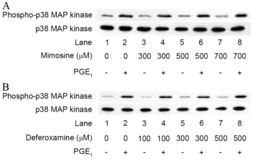 Cultured cells were pretreated with 300, 500 or 700 µM of mimosine or 100, 300 or 500 µM of deferoxamine for 60 min at 37°C, and then stimulated with 10 µM of PGE1 or vehicle (PBS supplemented with 0.01% BSA containing 0.1% ethanol) in α-MEM containing 0.3% FBS for 10 min for p38 MAP kinase and 20 min for SAPK/JNK, respectively. The cells were washed twice with phosphate-buffered saline and then lysed, homogenized and sonicated with ultrasonic disruptor (Tomy Seiko Co., Ltd, Tokyo, Japan) at 20 kHz for 10 sec in lysis buffer containing 62.5 mM Tris/HCl (pH 6.8), 2% sodium dodecyl sulfate (SDS), 50 mM dithiothreitol and 10% glycerol. The protein concentration in each cell lysate was determined by the Pierce BCA Protein Assay kit (cat. no. 23227, Thermo Fisher Scientific, Inc.). A total of 10 µl containing 10 µg of protein was loaded to each lane. SDS-polyacrylamide gel electrophoresis (PAGE) was performed in the method of Laemmli (23) using 10% polyacrylamide gel. Protein was fractionated and transferred onto Immun-Blot polyvinylidene fluoride (PVDF) membranes (Bio-Rad Laboratories, Inc., Hercules, CA, USA). The membranes were blocked with 5% fat-free dry milk in Tris-buffered saline-Tween (TBST; 20 mM Tris-HCl, pH 7.6, 137 mM NaCl, 0.1% Tween 20) for 1 h at room temperature prior to incubation with primary antibodies. A western blot analysis was performed as described previously (24) using phospho-specific p38 MAP kinase antibodies, p38 MAP kinase antibodies, phospho-specific SAPK/JNK antibodies or SAPK/JNK antibodies as primary antibodies with peroxidase-labeled goat anti-rabbit IgG antibodies being used as secondary antibodies (cat. no. 074-1506; KPL, Inc., Gaithersburg, MD, USA). Primary and secondary antibodies were diluted at 1:1,000 with 5% fat-free dry milk in TBST for overnight at room temperature for primary antibodies, and 1 h at room temperature for secondary antibodies, respectively. Peroxidase activity on the PVDF membrane was visualized on X-ray film by means of the ECL western blotting detection system.