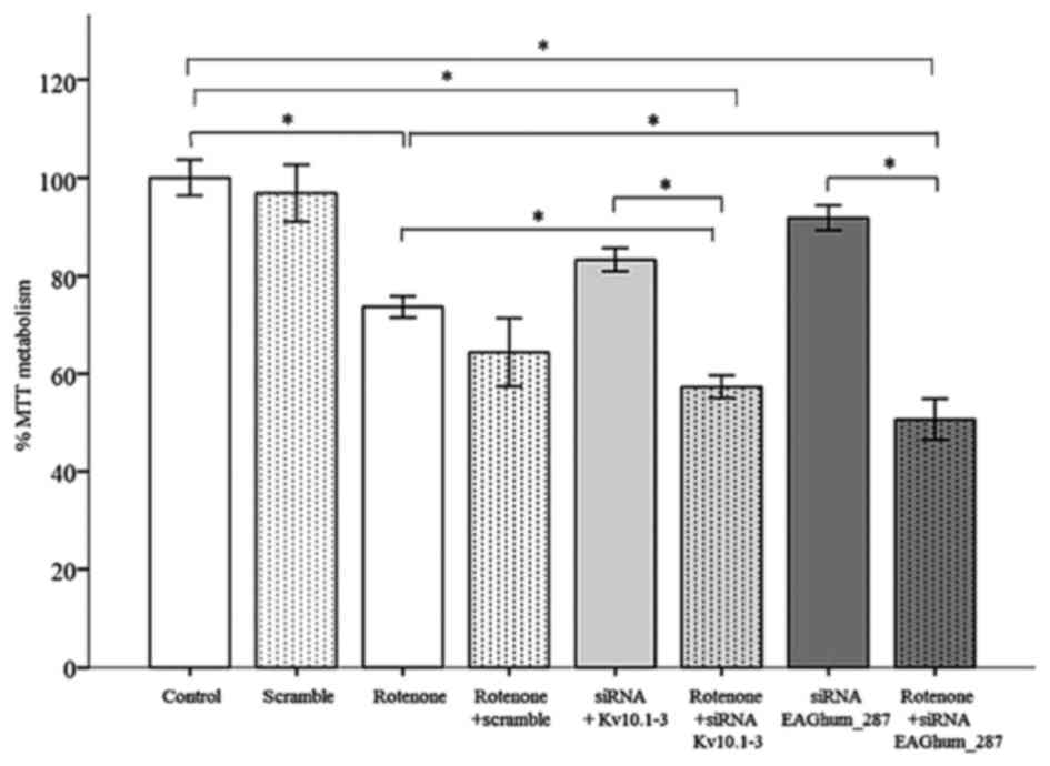 Quantification of cell viability was determined using a colorimetric assay with MTT (Invitrogen; Thermo Fisher Scientific, Inc.), which exhibits the mitochondrial activity of living cells. Cells were seeded in 96-well plates (5×104 cells/well) and incubated for 24 h in a humidified atmosphere containing 5% CO2 and 95% air at 37°C. Subsequently, cells were exposed to astemizole (2.5, 5.0 or 7.5 µM) or rotenone (2.5, 10.0 or 20.0 µM) for an additional period of 24 h. Cell viability was then determined by MTT. In siRNA-transfected groups, cells were exposed to rotenone for 24 h and transfected with EAG1hum_287 (18.75 nM) or the scramble control (18.75 nM) mixed with Lipofectamine. Cell viability was evaluated 24 h post-transfection. For the MTT assay, each well was treated with 50 µl MTT-labeling reagent (0.5 mg/ml), and the plate was incubated in a humidified atmosphere containing 5% CO2 and 95% air at 37°C for an additional 3 h. The formazan crystals were dissolved with dimethyl sulfoxide (Sigma-Aldrich; Merck Millipore), and MTT reduction was detected at 595 nm using a SpectraMax M2 (SpectraMax M2 Microplate Reader; Molecular Devices, LLC, Sunnyvale, CA, USA). Cell viability was measured as a percentage of the value observed in untreated control cells. The treatments were performed in triplicate and the experiments repeated three times. Experimental conditions and time points of the MTT assay are stated in the figure legends. MTT assay was also used to evaluate cell viability post-transfection with the miR-34a inhibitor. Cell transfection was executed at 2 or 24 h following rotenone exposure and cell viability was measured at 24 or 48 h.