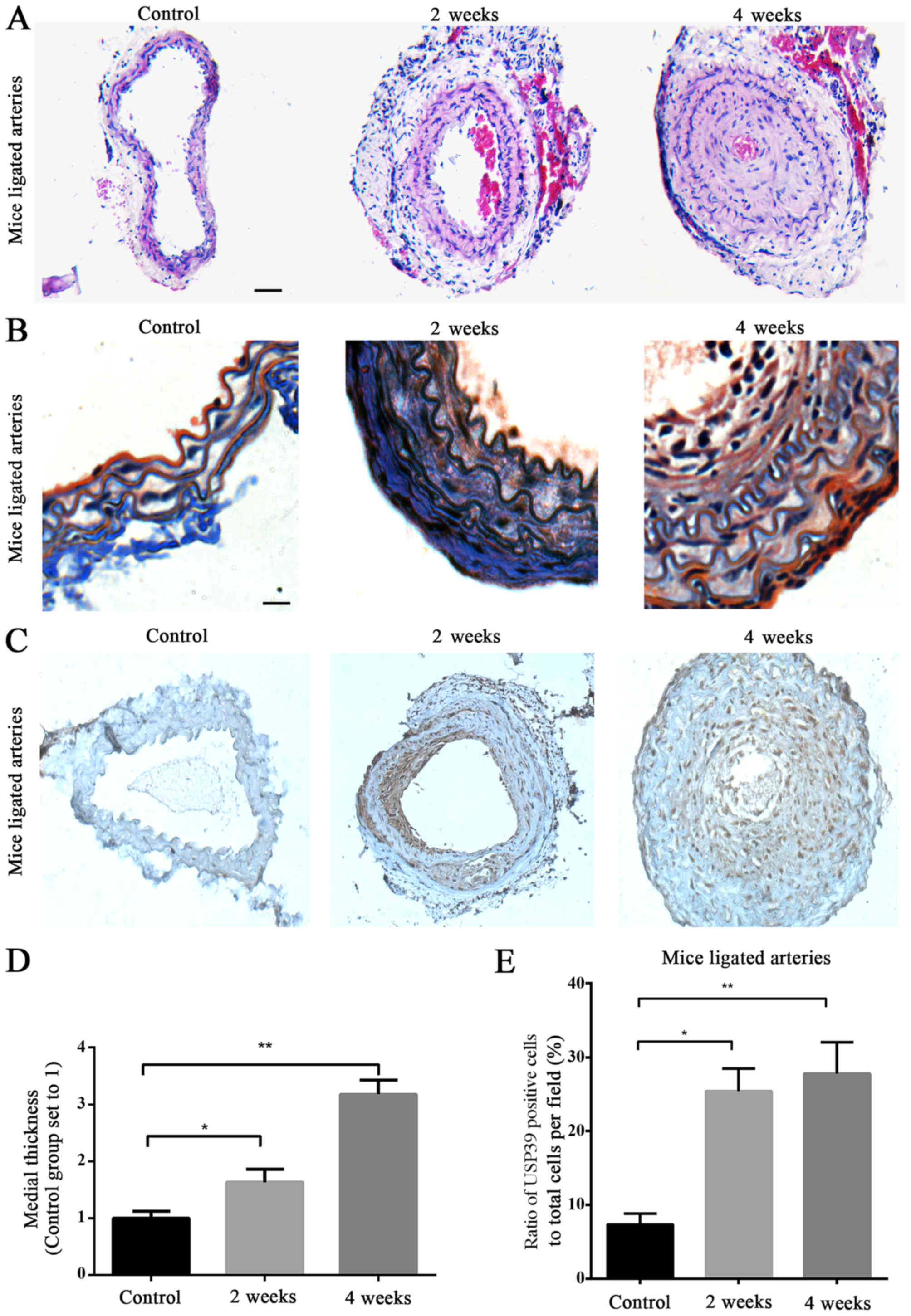 The results of the present study indicate that USP39 may be involved in the early stages and development of vascular injury. However, inflammation and vascular remodeling are continuous processes, and specific mechanisms of USP39 throughout these processes require further investigation.