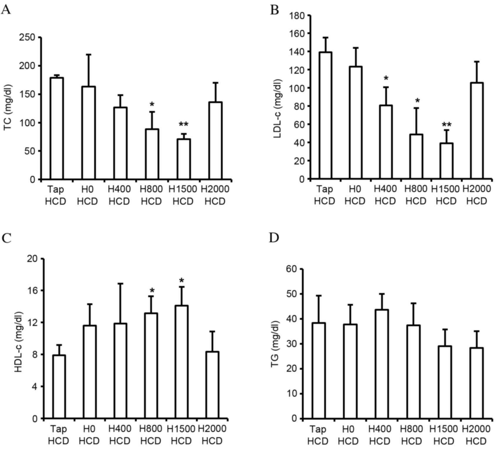 The present study monitored body weight, and food and water (tap water or DSW) intake, in rats fed a HCD. No significant differences in body weight (Fig. 1A) or food intake (Fig. 1B) were observed among the groups. However, reduced total water intake was observed in DSW groups in a hardness-dependent manner (Fig. 1C). In addition, blood lipid components were measured. Blood TC and LDL-c in rats fed a HCD were increased ~3.4- and 29.9-fold, respectively, and HDL-c was decreased ~4.8-fold compared with rats fed a ND (data not shown). Despite the decreased total water intake in DSW groups, significantly reduced levels of TC and LDL-c were observed in the H800 (P<0.05) and H1500 (P<0.01) HCD groups compared with the Tap HCD group (Fig. 2A and B). In addition, significantly increased HDL-c was detected in response to DSW in the H800 and H1500 HCD groups compared with in the Tap HCD group (P<0.05; Fig. 2C). However, no significant alterations in TG were observed among the groups (Fig. 2D).