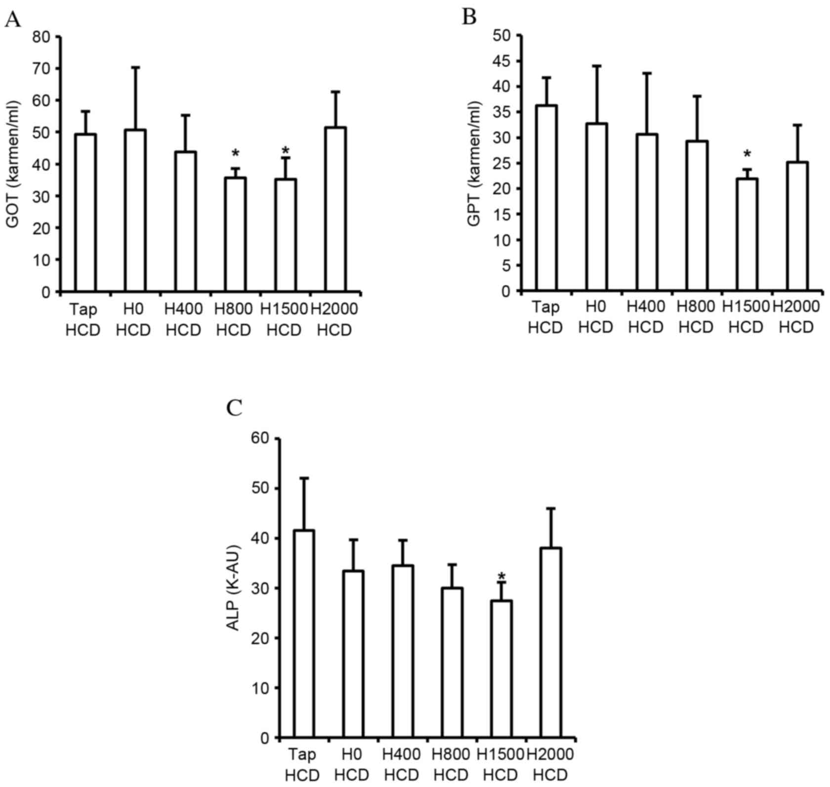 Lipid accumulation in the liver, and increased blood TC and LDL-c concentration, are associated with liver injury. The present study detected the suppressive effects of DSW on hepatic lipid accumulation, and the elevation of blood TC and LDL-c concentration. Therefore, the effects of DSW on liver injury indices in the blood, including GOT, GPT and ALP, were assessed. HCD-induced increased GOT, GPT and ALP levels in the blood were significantly decreased by H1500 DSW compared with the Tap HCD group (P<0.05; Fig. 4); however, H2000 DSW did not significantly reduce levels compared with the Tap HCD group (Fig. 4). The decrease in GOT, GPT and ALP levels corresponded with the decrease of hepatic lipid accumulation and blood TC and LDL-c levels.
