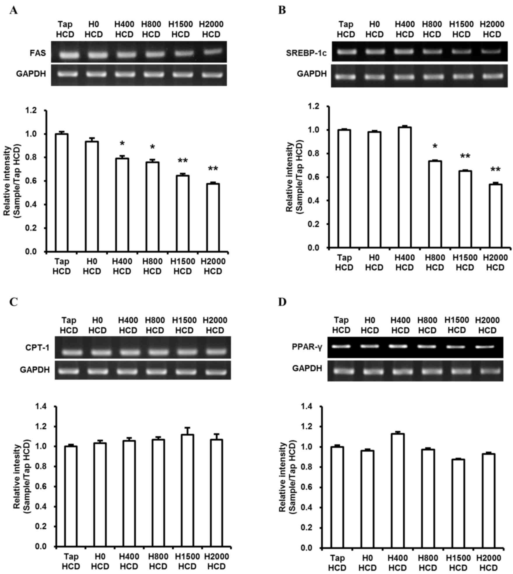 Lipid homeostasis in the liver is governed by the balance of expression between fatty acid-synthesizing enzymes and energy expenditure enzymes. Numerous studies have detected fat accumulation in the livers of HFD- and/or HCD-fed rodents (7,8,28). Furthermore, hepatic FAS, PPARγ and SREBP-1c expression in rodent livers have previously been demonstrated to be significantly increased by a HFD and/or HCD (8,11,16,28,29). Therefore, the present study investigated the difference in the expression of these genes between control and DSW groups in rats fed a HCD. In addition, the expression of CPT-1, an energy expenditure enzyme, was assessed. DSW groups exhibited significantly reduced levels of FAS and SREBP-1c expression in H800, H1500 and H2000 HCD groups compared with the Tap HCD group (P<0.05; Fig. 5A and B). However, no significant differences were observed in CPT-1 and PPARγ expression (Fig. 5C and D).