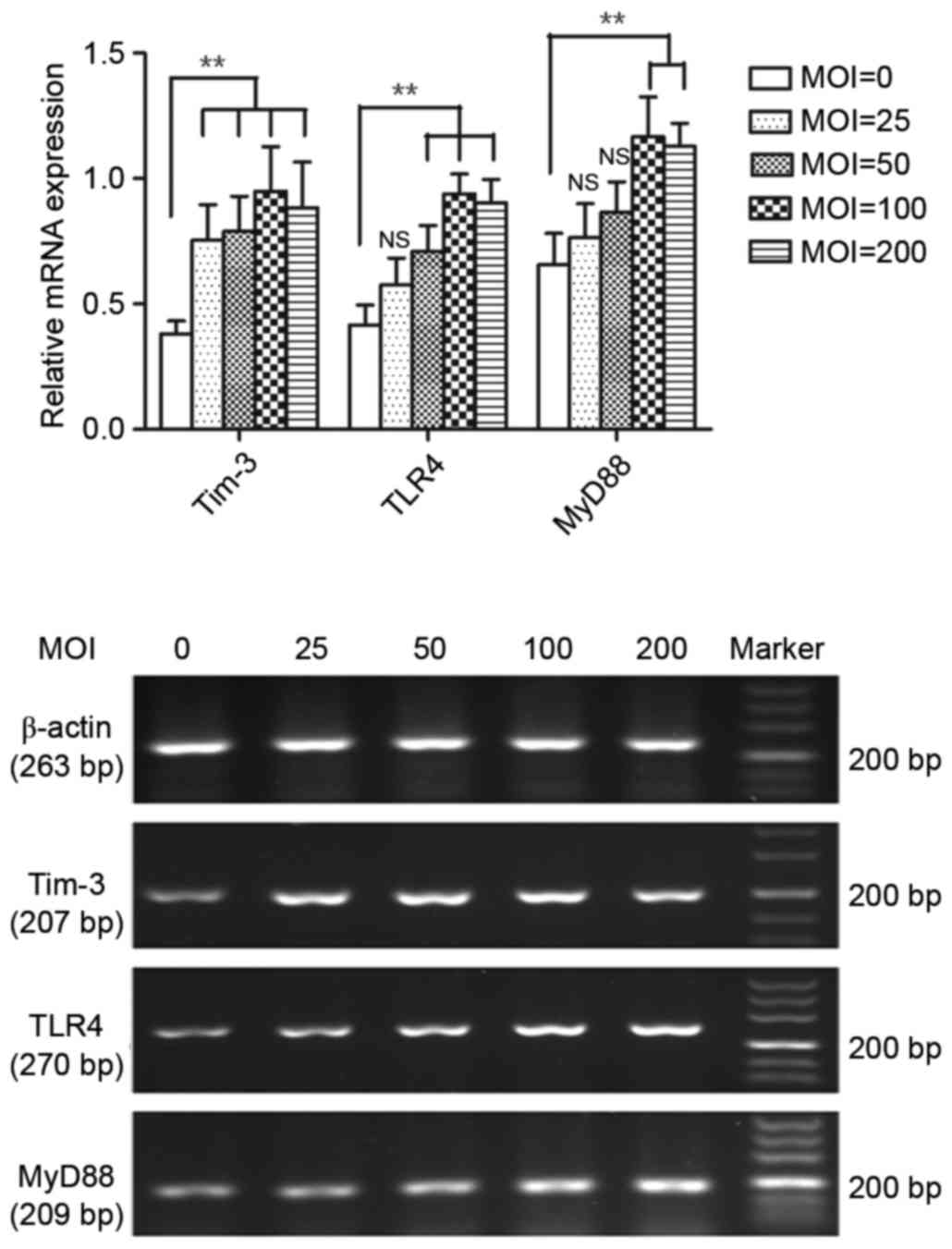 pylori infection on Tim-3 expression and TLR4 pathway proteins in Tim-3-overexpressing macrophages. RAW264.7 cells were either left untransfected (control), or were transfected with empty plasmid (mock) or Tim-3 overexpression plasmid (Tim-3), then cultured for an additional 12 h either alone or with H. pylori at an MOI of 100. In the control macrophages, Tim-3, TLR4, MyD88 mRNA and protein levels, and p-NF-κBp65 protein levels, were significantly higher in the H. pylori-infected cells compared with the H. pylori-negative cells (P<0.05; Fig. 3). In the Tim-3 overexpressing macrophages, TLR4 and MyD88 mRNA expression was increased following infection (P<0.01; Fig. 3A), but no significant change was observed in TLR4, MyD88 and p-NF-κBp65 protein levels between the H. pylori-infected and uninfected cells (P>0.05; Fig. 3B). H. pylori infection increased Tim-3 mRNA and protein expression in the Tim-3-overexpressing cells compared with the untransfected cells (P<0.05, Fig. 3). In addition, infected by H. pylori, TLR4 and MyD88 mRNA expression levels were significantly lower in the Tim-3-overexpressing cells compared with the untransfected cells (P<0.01; Fig. 3A), but no significant change was observed in TLR4, MyD88 and p-NF-κB p65 protein levels (P>0.05; Fig. 3B).