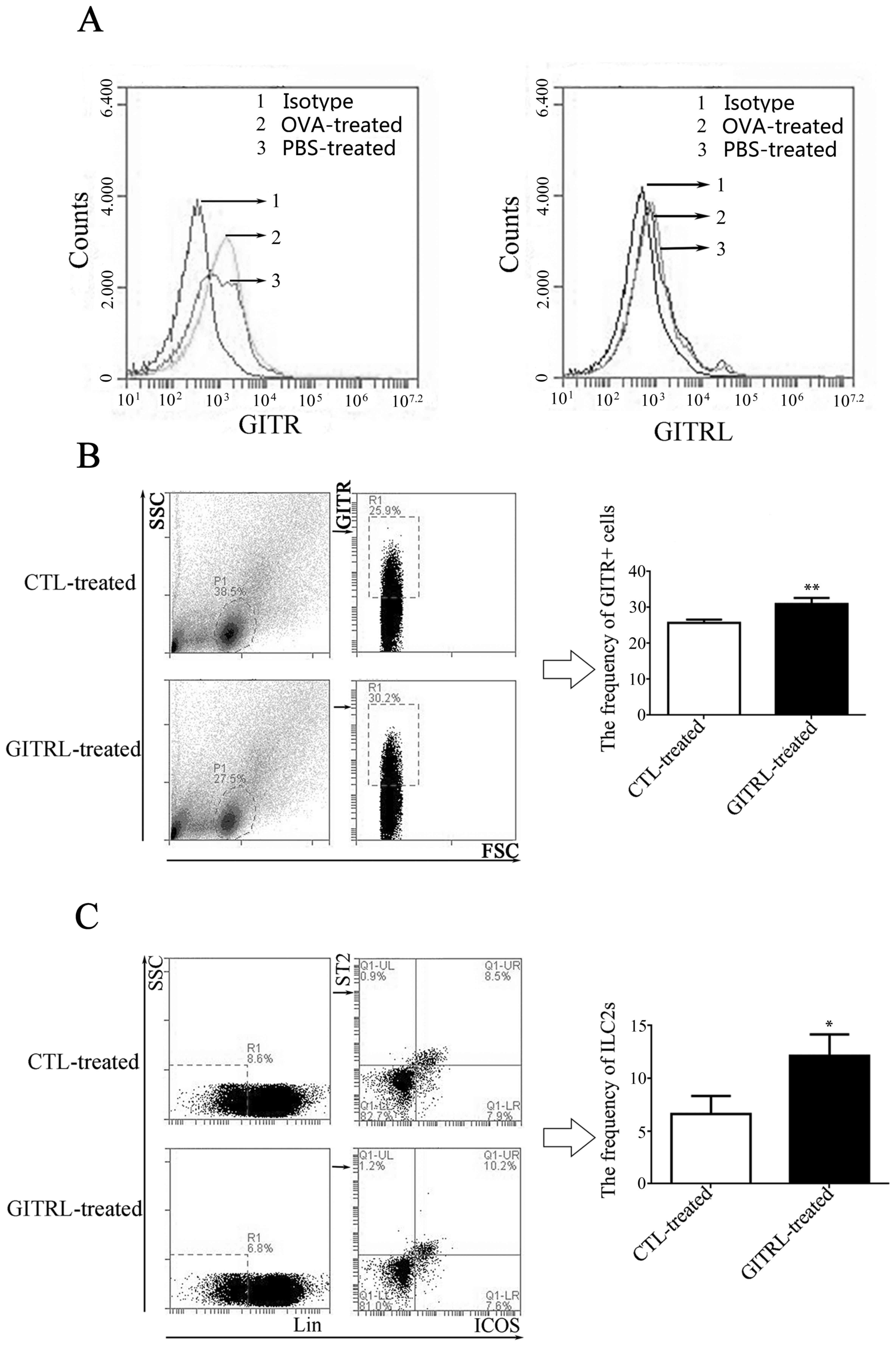 To determine the effect of GITRL on AHR, sensitized mice were treated intravenously with 20 µg GITRL or control protein prior to the first OVA challenge, and lung ILC2s were subsequently analyzed by flow cytometry. Compared with the controls, GITRL administration induced a significant increase in the frequency of GITR+ cells (Fig. 6B) and ILC2s (Fig. 6C) in lung tissue.