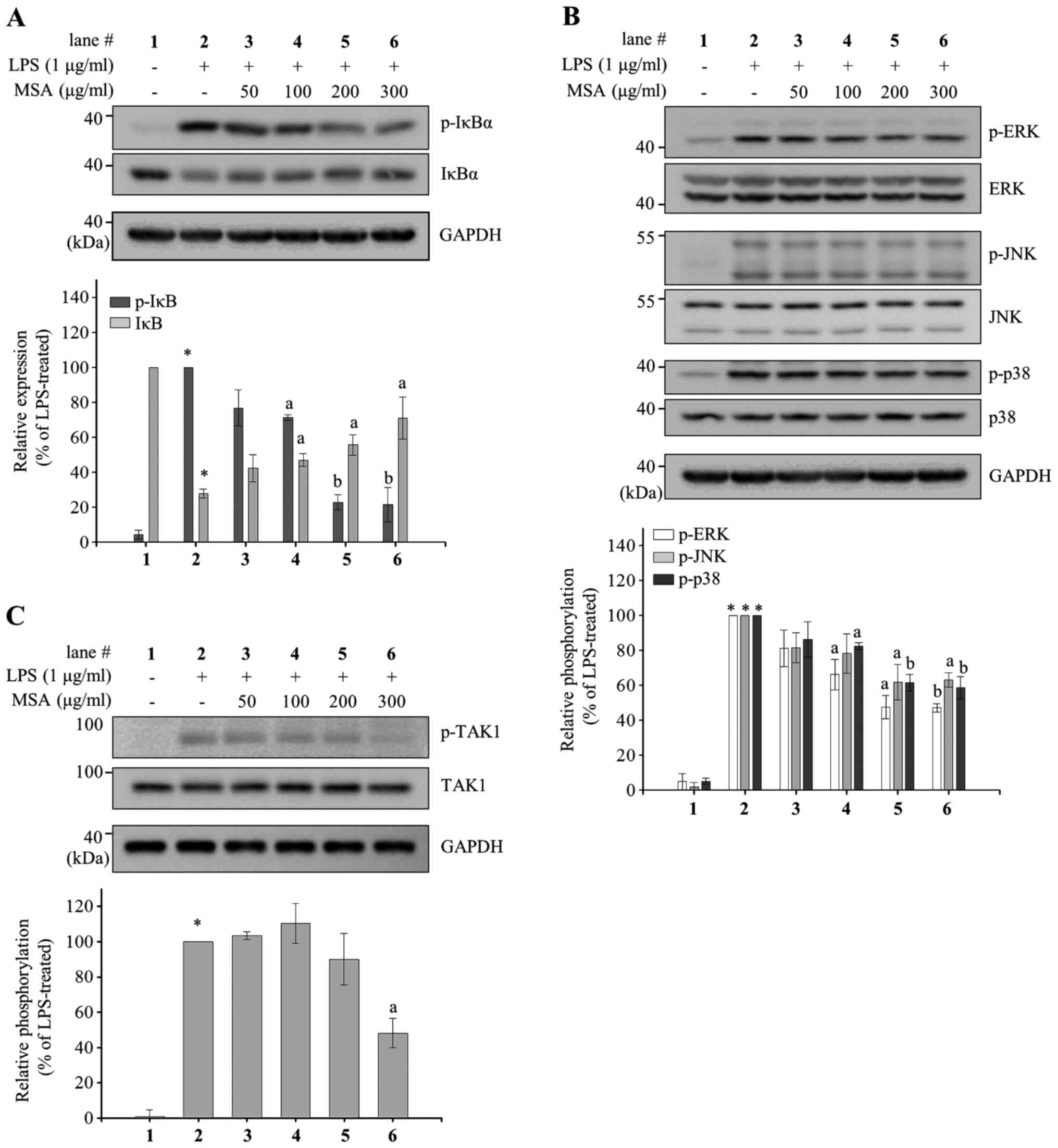 Further investigations were conducted to elucidate the action point of MSA in LPS-treated RAW 264.7 cells. Since MSA inhibits both NF-κB and MAPKs, the authors investigated the regulation of TAK1 phosphorylation level by MSA treatment in LPS-stimulated RAW 264.7 cells. As demonstrated in Fig. 4C, LPS-induced phosphorylation of TAK1 was inhibited by MSA treatment without changing total TAK1 protein levels. As presented in Fig. 4C, LPS-induced phosphorylation of TAK1 was inhibited by MSA treatment without changing total TAK1 protein levels.