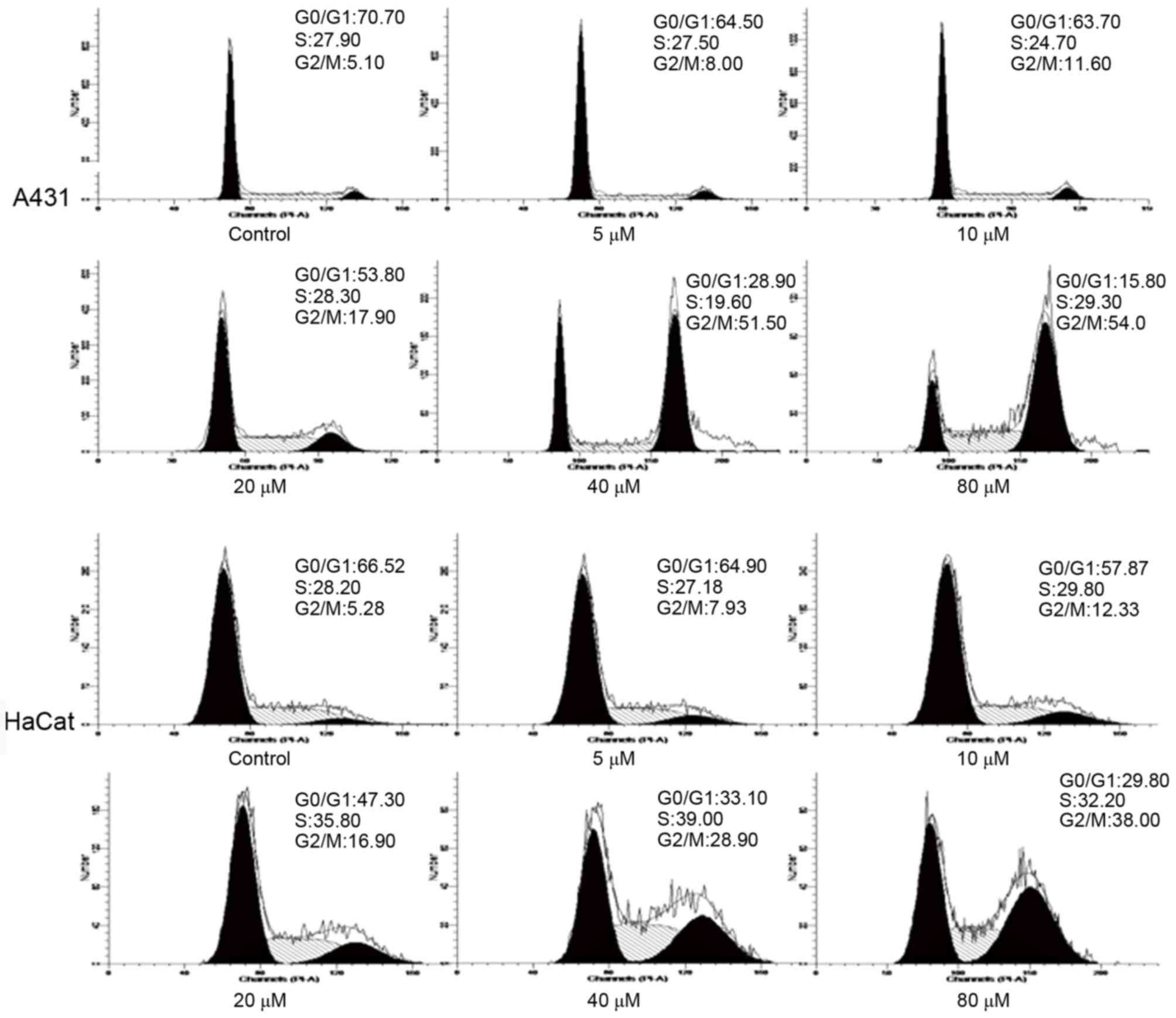 To further analyze the mechanism by which DMC inhibits cell viability, A431 and HaCaT cells were treated with 5, 10, 20, 40 and 80 µM DMC for 48 h and then analyzed for cell cycle phase distribution by flow cytometry. The results demonstrated that the percentage of cells in the G0/G1 phase was markedly decreased, whereas the percentage of cells in the G2/M phase was markedly increased in the DMC-treated cells compared with untreated cells (Fig. 4). These results indicated that cell cycle arrest at G2/M may contribute to the inhibitory effects of DMC on cell viability.