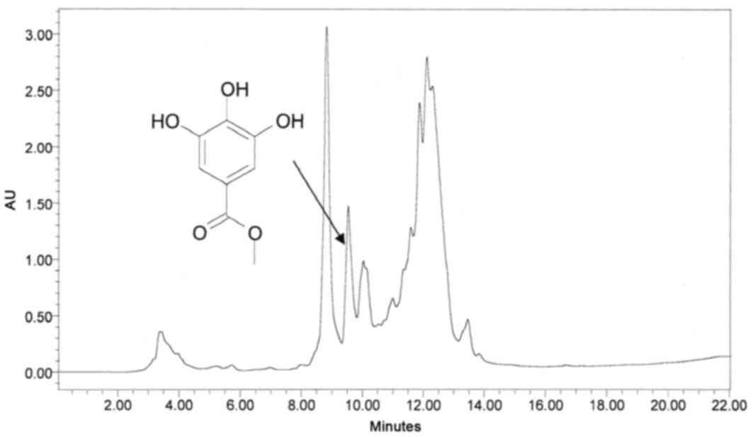 Kang MS, Oh JS, Kang IC, Hong SJ and Choi CH: Inhibitory effect of methyl gallate and gallic acid on oral bacteria. J Microbiol. 46:744–750. 2008. View Article : Google Scholar : PubMed/NCBI | |