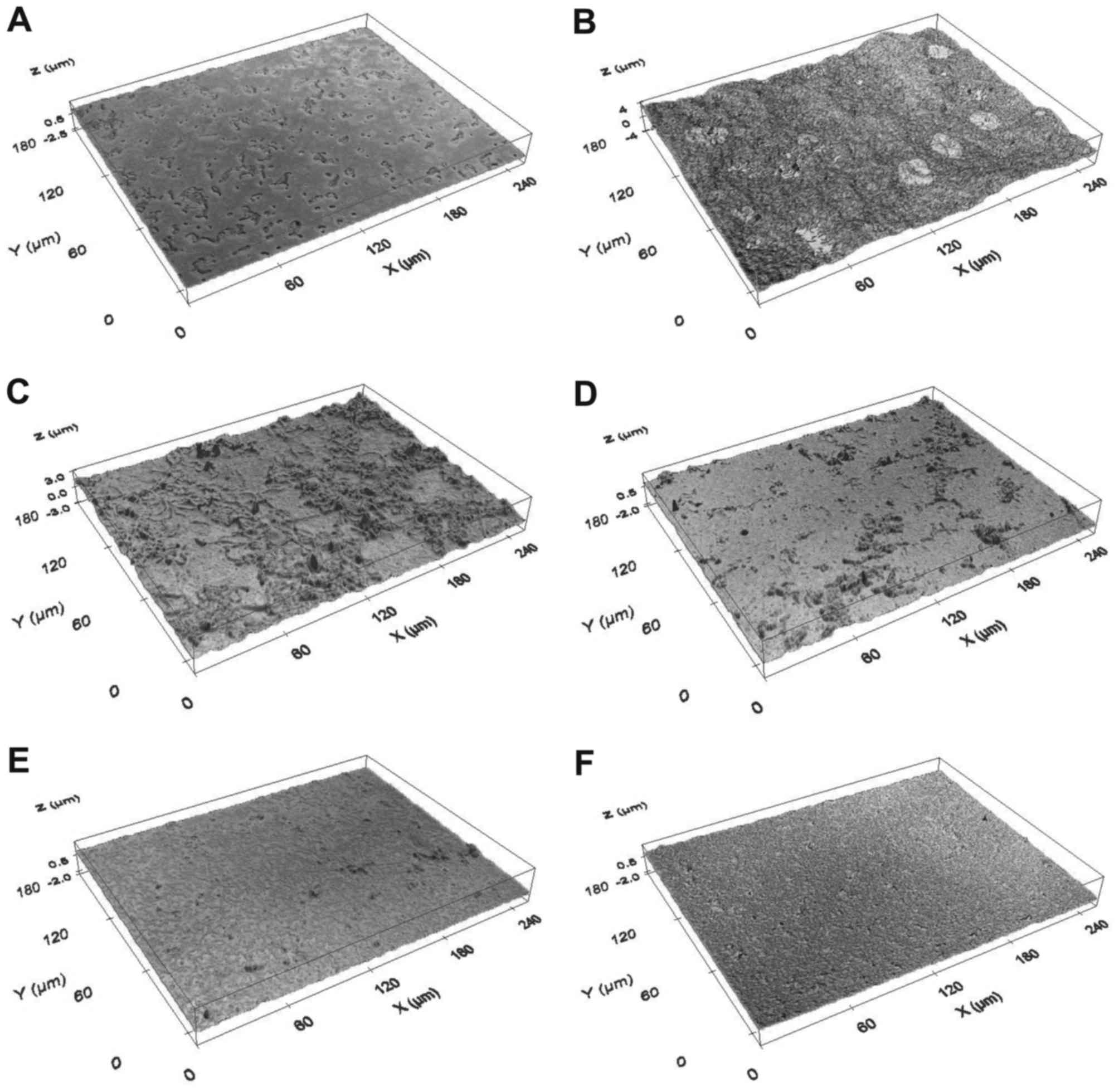 Following 24 h of incubation, glass slides with adherent S. mutans biofilm were removed from plate wells, air-dried and further analyzed using a non-contact optical imaging profilometer Sensofar PLµ 2300 system (Terrassa, Spain), using a ×50 confocal objective with a view field of 253×190 µm. Primarily, six regions of the glass slide were scanned seeking to evaluate surface roughness per slide halfway from bottom to top of visible biofilm. Afterwards, a vertical scratch was artificially made down the glass surface by a scalpel in the middle of every slide covered with biofilm, and then five regions of the glass slide were scanned to assess the biofilm thickness per slide halfway from the bottom to the top of the visible biofilm. The bottom of the scratch served as a reference point for accurate measurement of the biofilm thickness. All images were captured in a vertical scanning mode, and data of the collected images were further processed using Gwyddion software (version 2.40; http://gwyddion.net) to calculate the surface roughness and biofilm thickness parameters. A median filter (10 pixels or 3 µm) was selected to remove the errors of form and waviness. Root mean square roughness (Rq), as the most critical parameter, was calculated to evaluate quantitatively the slide surface roughness, which indicated adherence of bacteria. The Rq parameter is an average of the measured height deviations taken within the evaluation length and measured from the mean line. Indeed, Rq represents standard deviation of the surface profile heights, and it is calculated according to ISO 4287/1-1997 standard by the following formula: