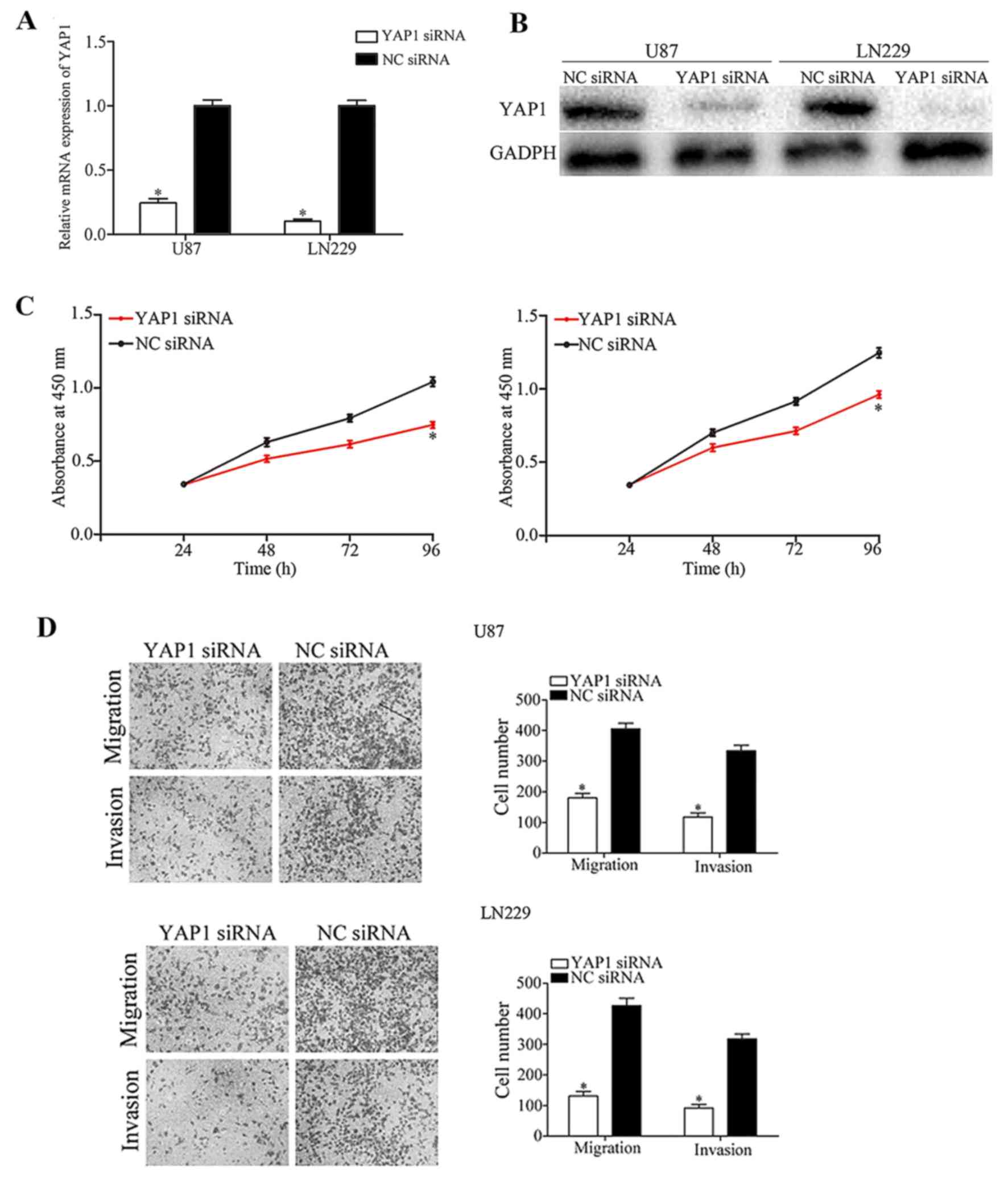 In the present study, YAP1 was identified to be a direct target of miR-205 in glioma. Therefore, it was subsequently investigated whether YAP1 acts as a downstream effector of miR-205, mediating its tumor suppressive functions. U87 and LN229 cells were transfected with YAP1 or NC siRNA. Following transfection, RT-qPCR analysis and western blotting was performed to measure YAP1 mRNA and protein expression, respectively. The results demonstrated that YAP1 was significantly downregulated at the mRNA (Fig. 4A; P<0.05) and protein levels (Fig. 4B; P<0.05), in YAP1 siRNA-transfected U87 and LN229 cells.