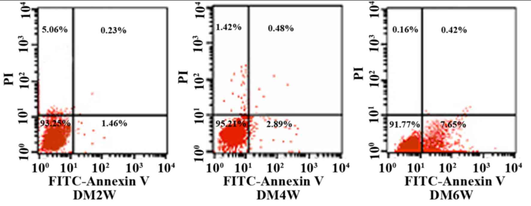An Annexin V-FITC/propidium iodide (PI) flow cytometry kit (BD Biosciences, Franklin Lakes, NJ, USA) was used to detect cell apoptosis. Annexin V is regarded as a sensitive indicator of early apoptosis as it binds to phosphatidylserine on the cell membranes of early apoptotic cells, whereas PI stains cell nuclei red by readily crossing the cell membranes of late apoptotic and dead cells. Briefly, the cells were rinsed with phosphate-buffered saline twice and centrifuged at 243 × g for 5 min at 4°C, following which 1×105 cells were collected and suspended in 500 µl binding buffer mixed with 5 µl Annexin V-EGFP and 5 µl PI. This mixture was incubated at room temperature in the dark for 5–15 min. Flow cytometry was used to observe cell apoptosis in the DM2W, DM4W and DM6W groups. The cells were divided into four quadrants, the abscissa was FITC-Annexin V, and the ordinate was PI. The upper right quadrant represented late apoptotic cells, the upper left quadrant represented necrotic cells, the lower left quadrant represented normal cells, and the lower right quadrant represented early apoptotic cells. Apoptotic rates were measured as the percentage of apoptotic cells to total cells.