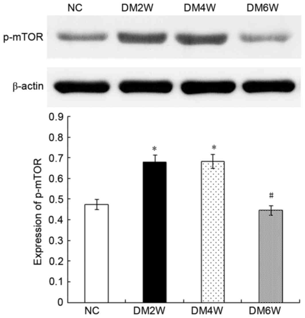 The expression of p-mTOR was 0.48±0.03 in the NC group, which was lower than the level observed in the DM2W (0.67±0.04) and DM4W (0.68±0.03) groups (n=10; P<0.01). Compared with the DM4W group, the DM6W group showed lower levels of p-mTOR (0.45±0.02; n=10; P<0.01). As shown in Fig. 2, no significant difference was observed between the NC and DM6W groups.