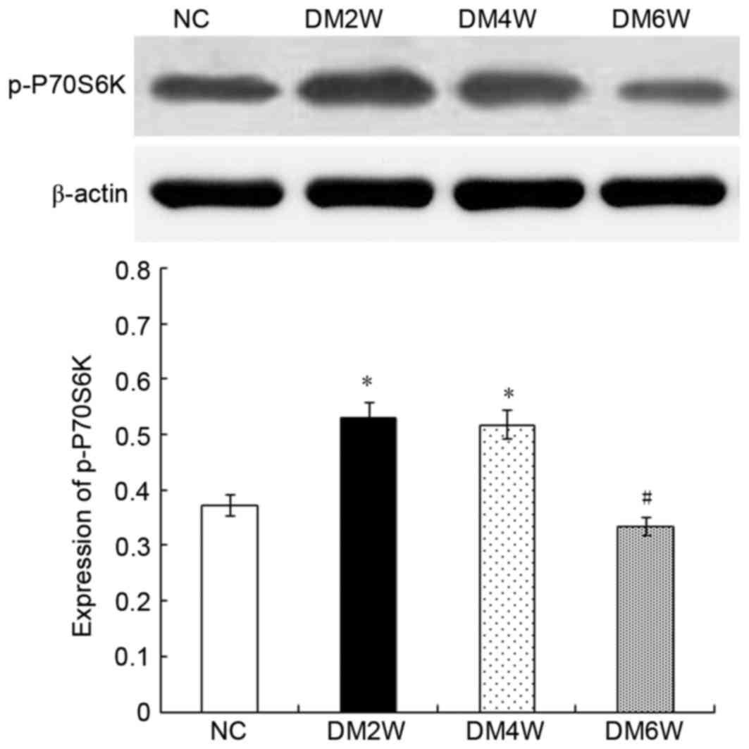 Relative protein expression of p-P70S6KCompared with the NC group (0.37±0.04), the expression levels of p-P70S6K were higher in the DM2W (0.53±0.02) and DM4W (0.52±0.02) groups (n=10; P<0.01). The DM6W group (0.34±0.02) exhibited a decreased expression level of p-P70S6K compared with the DM4W group (n=10; P<0.01). As shown in Fig. 4, no significant difference was observed between the NC and DM6W groups.