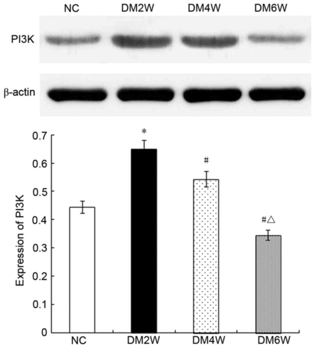 Relative protein expression of PI3KCompared with the NC group (0.44±0.03), the expression levels of PI3K were higher in the DM2W (0.65±0.03) and DM4W (0.54±0.06) groups (n=10; P<0.01), whereas the DM6W group exhibited lower expression (0.35±0.05; n=10; P<0.01). The expression levels were also lower in the DM4W and DM6W groups (n=10; P<0.01), as shown in Fig. 5.