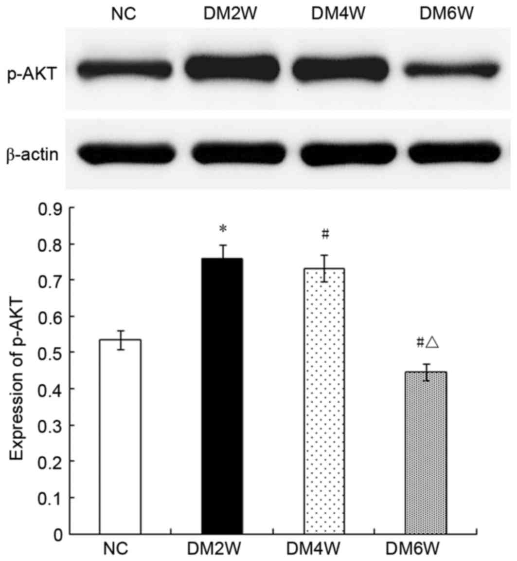 Relative protein expression of p-AKTThe expression levels of p-AKT were higher in the DM2W (0.75±0.02) and DM4W (0.73±0.03) groups, compared with that in the NC group (0.53±0.02; n=10; P<0.01). By contrast, the DM6W group exhibited lower expression (0.44±0.02; n=10; P<0.01). As shown in Fig. 6, the expression levels were significantly lower in the DM4W and DM6W groups, compared with that in the DM2W group (n=10; P<0.01).