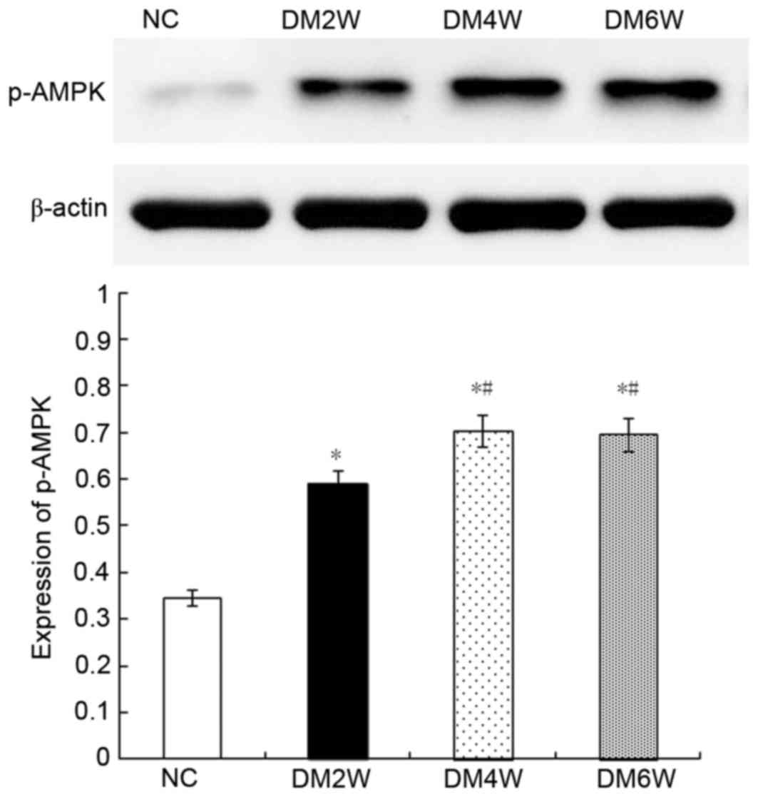Relative protein expression of p-AMPKCompared with the NC group (0.34±0.04), the expression levels of p-AMPK were higher in the DM2W (0.58±0.05), DM4W (0.70±0.05) and DM6W (0.69±0.05) groups (n=10; P<0.01). The expression levels were increased in the DM4W and DM6W groups, compared with that in the DM2W group (n=10; P<0.01); however, no significant difference was observed between the DM4W and DM6W groups, as shown in Fig. 7.